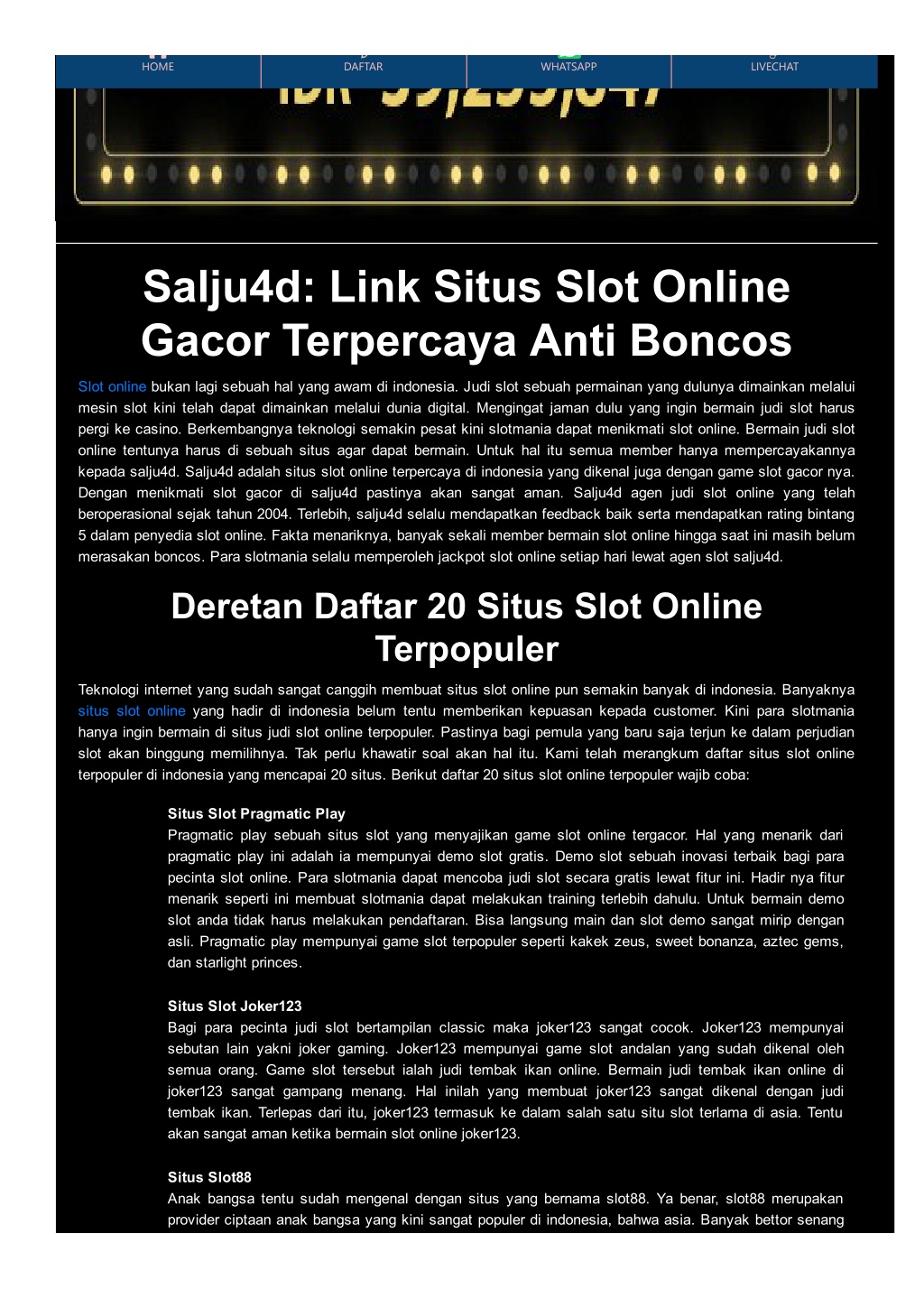 HOME DAFTAR WHATSAPP LIVECHAT Salju4d: Link Situs Slot Online Gacor Terpercaya Anti Boncos Slot online bukan lagi sebuah hal yang awam di indonesia. Judi slot sebuah permainan yang dulunya dimainkan melalui mesin slot kini telah dapat dimainkan melalui dunia digital. Mengingat jaman dulu yang ingin bermain judi slot harus pergi ke casino. Berkembangnya teknologi semakin pesat kini slotmania dapat menikmati slot online. Bermain judi slot online tentunya harus di sebuah situs agar dapat bermain. Untuk hal itu semua member hanya mempercayakannya kepada salju4d. Salju4d adalah situs slot online terpercaya di indonesia yang dikenal juga dengan game slot gacor nya. Dengan menikmati slot gacor di salju4d pastinya akan sangat aman. Salju4d agen judi slot online yang telah beroperasional sejak tahun 2004. Terlebih, salju4d selalu mendapatkan feedback baik serta mendapatkan rating bintang 5 dalam penyedia slot online. Fakta menariknya, banyak sekali member bermain slot online hingga saat ini masih belum merasakan boncos. Para slotmania selalu memperoleh jackpot slot online setiap hari lewat agen slot salju4d. Deretan Daftar 20 Situs Slot Online Terpopuler Teknologi internet yang sudah sangat canggih membuat situs slot online pun semakin banyak di indonesia. Banyaknya situs slot online yang hadir di indonesia belum tentu memberikan kepuasan kepada customer. Kini para slotmania hanya ingin bermain di situs judi slot online terpopuler. Pastinya bagi pemula yang baru saja terjun ke dalam perjudian slot akan binggung memilihnya. Tak perlu khawatir soal akan hal itu. Kami telah merangkum daftar situs slot online terpopuler di indonesia yang mencapai 20 situs. Berikut daftar 20 situs slot online terpopuler wajib coba: Situs Slot Pragmatic Play Pragmatic play sebuah situs slot yang menyajikan game slot online tergacor. Hal yang menarik dari pragmatic play ini adalah ia mempunyai demo slot gratis. Demo slot sebuah inovasi terbaik bagi para pecinta slot online. Para slotmania dapat mencoba judi slot secara gratis lewat fitur ini. Hadir nya fitur menarik seperti ini membuat slotmania dapat melakukan training terlebih dahulu. Untuk bermain demo slot anda tidak harus melakukan pendaftaran. Bisa langsung main dan slot demo sangat mirip dengan asli. Pragmatic play mempunyai game slot terpopuler seperti kakek zeus, sweet bonanza, aztec gems, dan starlight princes. Situs Slot Joker123 Bagi para pecinta judi slot bertampilan classic maka joker123 sangat cocok. Joker123 mempunyai sebutan lain yakni joker gaming. Joker123 mempunyai game slot andalan yang sudah dikenal oleh semua orang. Game slot tersebut ialah judi tembak ikan online. Bermain judi tembak ikan online di joker123 sangat gampang menang. Hal inilah yang membuat joker123 sangat dikenal dengan judi tembak ikan. Terlepas dari itu, joker123 termasuk ke dalam salah satu situ slot terlama di asia. Tentu akan sangat aman ketika bermain slot online joker123. Situs Slot88 Anak bangsa tentu sudah mengenal dengan situs yang bernama slot88. Ya benar, slot88 merupakan provider ciptaan anak bangsa yang kini sangat populer di indonesia, bahwa asia. Banyak bettor senang bermain di slot88 disebabkan tampilannya yang begitu lembut dan ciamik. Para slotmania dapat bermain