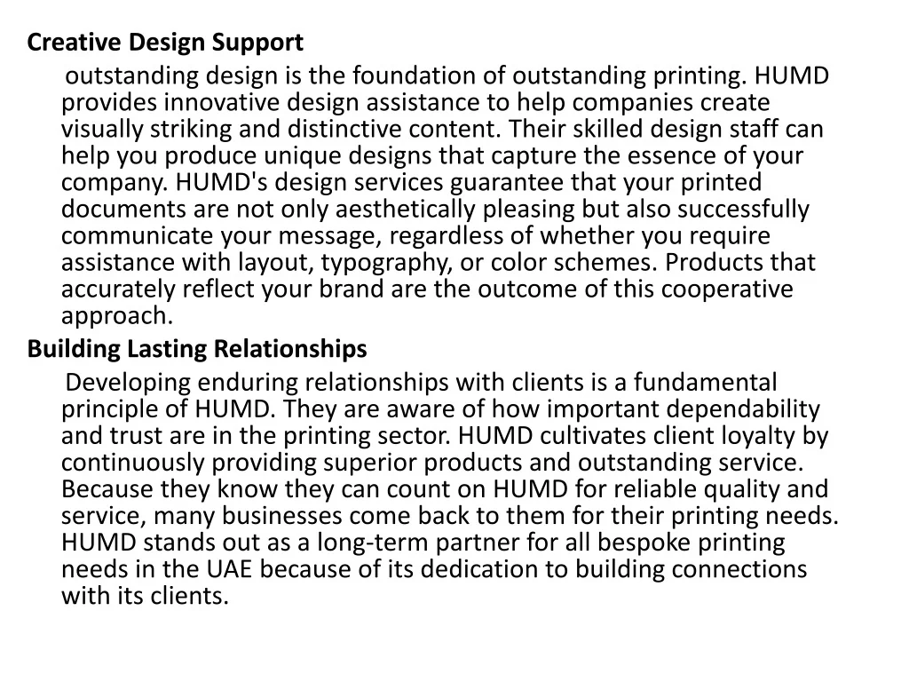 Creative Design Support outstanding design is the foundation of outstanding printing. HUMD provides innovative design assistance to help companies create visually striking and distinctive content. Their skilled design staff can help you produce unique designs that capture the essence of your company. HUMD's design services guarantee that your printed documents are not only aesthetically pleasing but also successfully communicate your message, regardless of whether you require assistance with layout, typography, or color schemes. Products that accurately reflect your brand are the outcome of this cooperative approach. Building Lasting Relationships Developing enduring relationships with clients is a fundamental principle of HUMD. They are aware of how important dependability and trust are in the printing sector. HUMD cultivates client loyalty by continuously providing superior products and outstanding service. Because they know they can count on HUMD for reliable quality and service, many businesses come back to them for their printing needs. HUMD stands out as a long-term partner for all bespoke printing needs in the UAE because of its dedication to building connections with its clients.