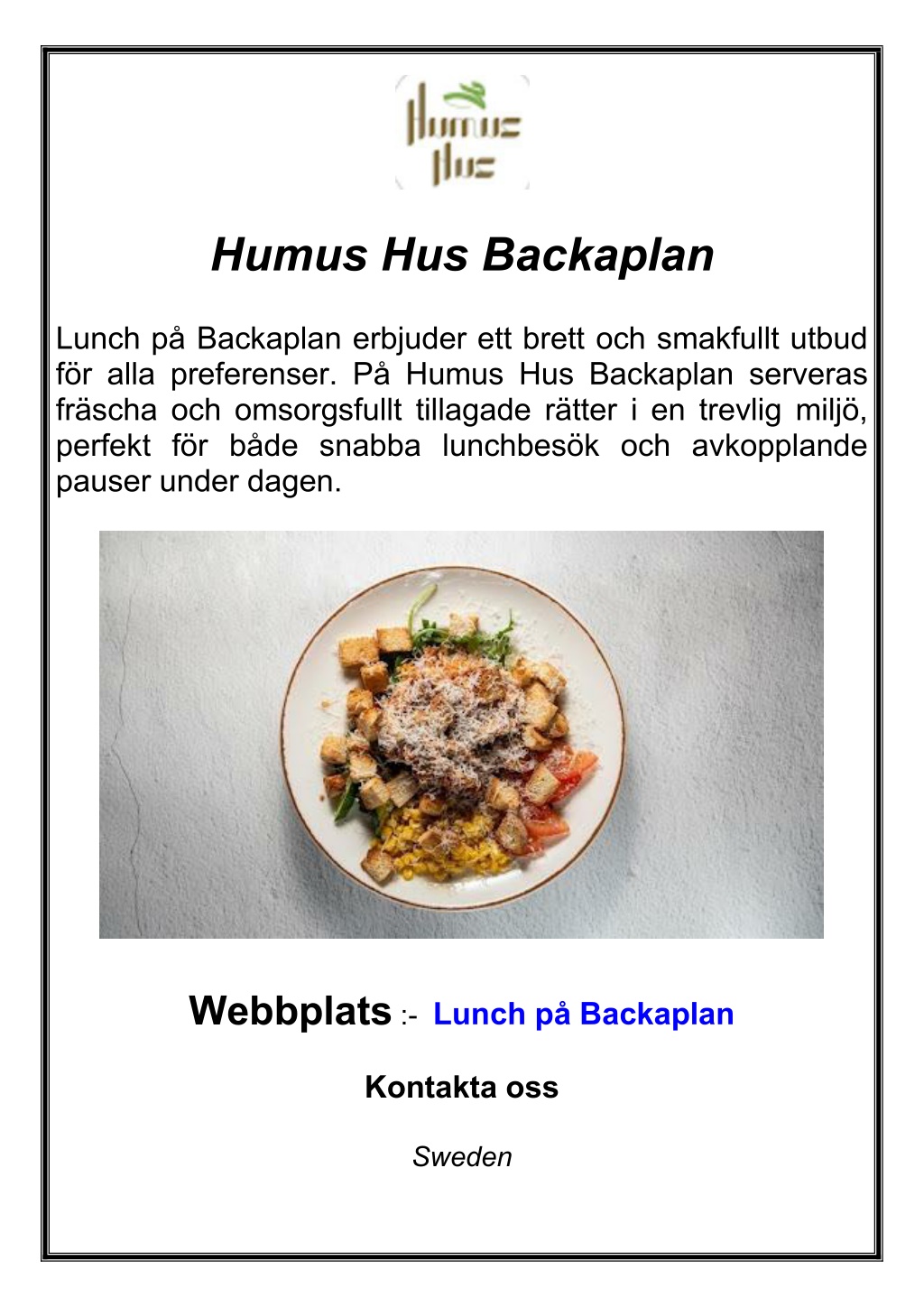 1. Humus Hus Backaplan Lunch på Backaplan erbjuder ett brett och smakfullt utbud för alla preferenser. På Humus Hus Backaplan serveras fräscha och omsorgsfullt tillagade rätter i en trevlig miljö, perfekt för både snabba lunchbesök och avkopplande pauser under dagen. Webbplats :- Lunch på Backaplan Kontakta oss Sweden