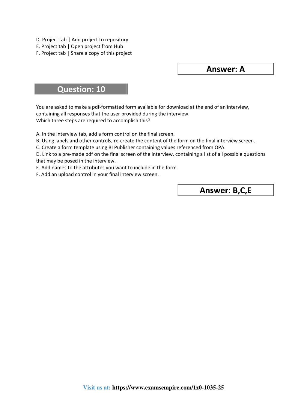 D.Project tab | Add project to repository E.Project tab | Open project from Hub F.Project tab | Share a copy of this project Answer: A Question: 10 You are asked to make a pdf-formatted form available for download at the end of an interview, containing all responses that the user provided during the interview. Which three steps are required to accomplish this? A.In the Interview tab, add a form control on the final screen. B.Using labels and other controls, re-create the content of the form on the final interview screen. C.Create a form template using BI Publisher containing values referenced from OPA. D.Link to a pre-made pdf on the final screen of the interview, containing a list of all possible questions that may be posed in the interview. E.Add names to the attributes you want to include in the form. F.Add an upload control in your final interview screen. Answer: B,C,E Visit us at: https://www.examsempire.com/1z0-1035-25
