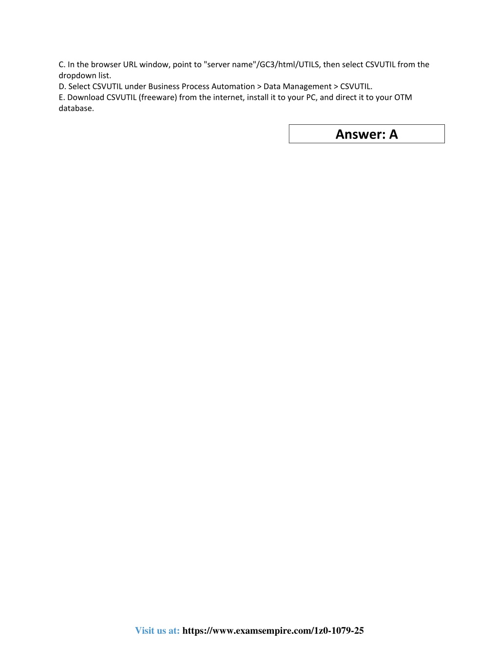 C.In the browser URL window, point to "server name"/GC3/html/UTILS, then select CSVUTIL from the dropdown list. D.Select CSVUTIL under Business Process Automation > Data Management > CSVUTIL. E.Download CSVUTIL (freeware) from the internet, install it to your PC, and direct it to your OTM database. Answer: A Visit us at: https://www.examsempire.com/1z0-1079-25