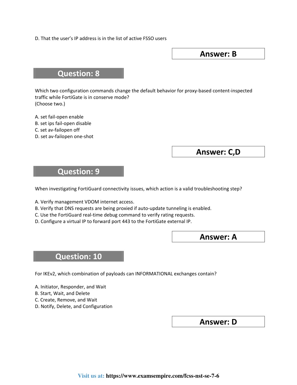 D.That the user’s IP address is in the list of active FSSO users Answer: B Question: 8 Which two configuration commands change the default behavior for proxy-based content-inspected traffic while FortiGate is in conserve mode? (Choose two.) A.set fail-open enable B.set ips fail-open disable C.set av-failopen off D.set av-failopen one-shot Answer: C,D Question: 9 When investigating FortiGuard connectivity issues, which action is a valid troubleshooting step? A.Verify management VDOM internet access. B.Verify that DNS requests are being proxied if auto-update tunneling is enabled. C.Use the FortiGuard real-time debug command to verify rating requests. D.Configure a virtual IP to forward port 443 to the FortiGate external IP. Answer: A Question: 10 For IKEv2, which combination of payloads can INFORMATIONAL exchanges contain? A.Initiator, Responder, and Wait B.Start, Wait, and Delete C.Create, Remove, and Wait D.Notify, Delete, and Configuration Answer: D Visit us at: https://www.examsempire.com/fcss-nst-se-7-6
