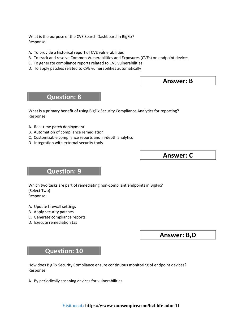 What is the purpose of the CVE Search Dashboard in BigFix? Response: A.To provide a historical report of CVE vulnerabilities B.To track and resolve Common Vulnerabilities and Exposures (CVEs) on endpoint devices C.To generate compliance reports related to CVE vulnerabilities D.To apply patches related to CVE vulnerabilities automatically Answer: B Question: 8 What is a primary benefit of using BigFix Security Compliance Analytics for reporting? Response: A.Real-time patch deployment B.Automation of compliance remediation C.Customizable compliance reports and in-depth analytics D.Integration with external security tools Answer: C Question: 9 Which two tasks are part of remediating non-compliant endpoints in BigFix? (Select Two) Response: A.Update firewall settings B.Apply security patches C.Generate compliance reports D.Execute remediation tas Answer: B,D Question: 10 How does BigFix Security Compliance ensure continuous monitoring of endpoint devices? Response: A.By periodically scanning devices for vulnerabilities Visit us at: https://www.examsempire.com/hcl-bfc-adm-11