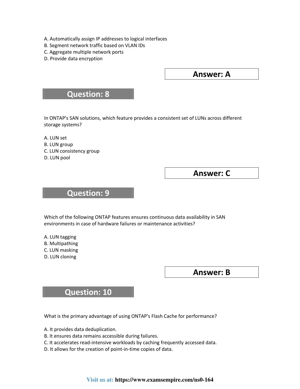 A. Automatically assign IP addresses to logical interfaces B. Segment network traffic based on VLAN IDs C. Aggregate multiple network ports D. Provide data encryption Answer: A Question: 8 In ONTAP's SAN solutions, which feature provides a consistent set of LUNs across different storage systems? A. LUN set B. LUN group C. LUN consistency group D. LUN pool Answer: C Question: 9 Which of the following ONTAP features ensures continuous data availability in SAN environments in case of hardware failures or maintenance activities? A. LUN tagging B. Multipathing C. LUN masking D. LUN cloning Answer: B Question: 10 What is the primary advantage of using ONTAP's Flash Cache for performance? A. It provides data deduplication. B. It ensures data remains accessible during failures. C. It accelerates read-intensive workloads by caching frequently accessed data. D. It allows for the creation of point-in-time copies of data. Visit us at: https://www.examsempire.com/ns0-164