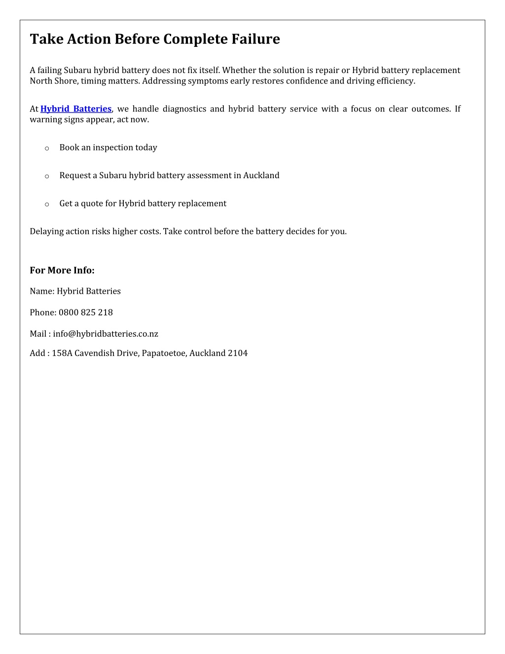 Take Action Before Complete Failure A failing Subaru hybrid battery does not fix itself. Whether the solution is repair or Hybrid battery replacement North Shore, timing matters. Addressing symptoms early restores confidence and driving efficiency. At Hybrid Batteries, we handle diagnostics and hybrid battery service with a focus on clear outcomes. If warning signs appear, act now. oBook an inspection today oRequest a Subaru hybrid battery assessment in Auckland oGet a quote for Hybrid battery replacement Delaying action risks higher costs. Take control before the battery decides for you. For More Info: Name: Hybrid Batteries Phone: 0800 825 218 Mail : info@hybridbatteries.co.nz Add : 158A Cavendish Drive, Papatoetoe, Auckland 2104
