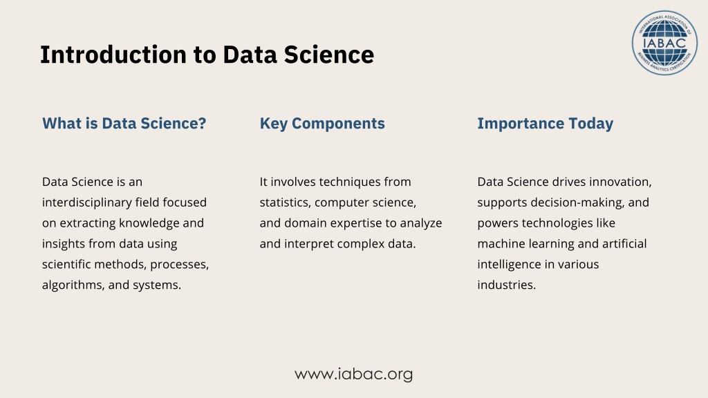 Introduction to Data Science What is Data Science? Key Components Importance Today Data Science is an interdisciplinary field focused on extracting knowledge and insights from data using scientific methods, processes, algorithms, and systems. It involves techniques from statistics, computer science, and domain expertise to analyze and interpret complex data. Data Science drives innovation, supports decision-making, and powers technologies like machine learning and artificial intelligence in various industries. www.iabac.org