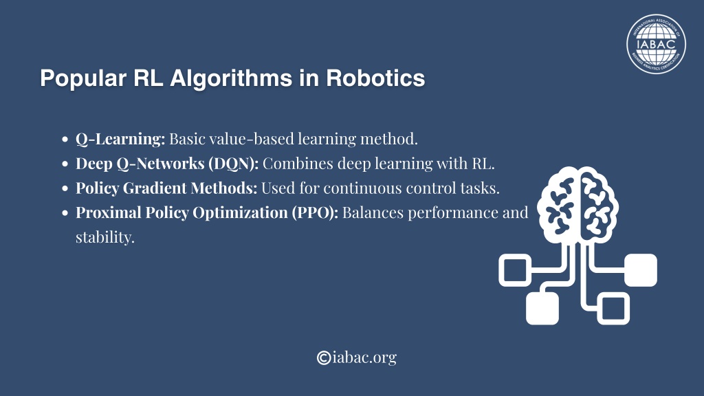 5. Popular RL Algorithms in Robotics Q-Learning: Basic value-based learning method. Deep Q-Networks (DQN): Combines deep learning with RL. Policy Gradient Methods: Used for continuous control tasks. Proximal Policy Optimization (PPO): Balances performance and stability. iabac.org