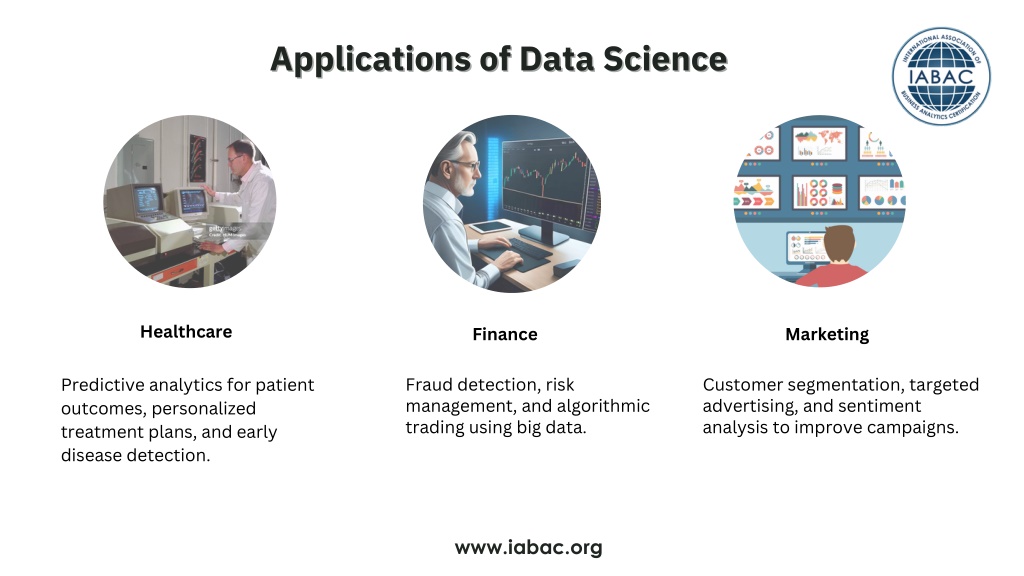 Applications of Data Science Applications of Data Science Healthcare Finance Marketing Fraud detection, risk management, and algorithmic trading using big data. Customer segmentation, targeted advertising, and sentiment analysis to improve campaigns. Predictive analytics for patient outcomes, personalized treatment plans, and early disease detection. www.iabac.org