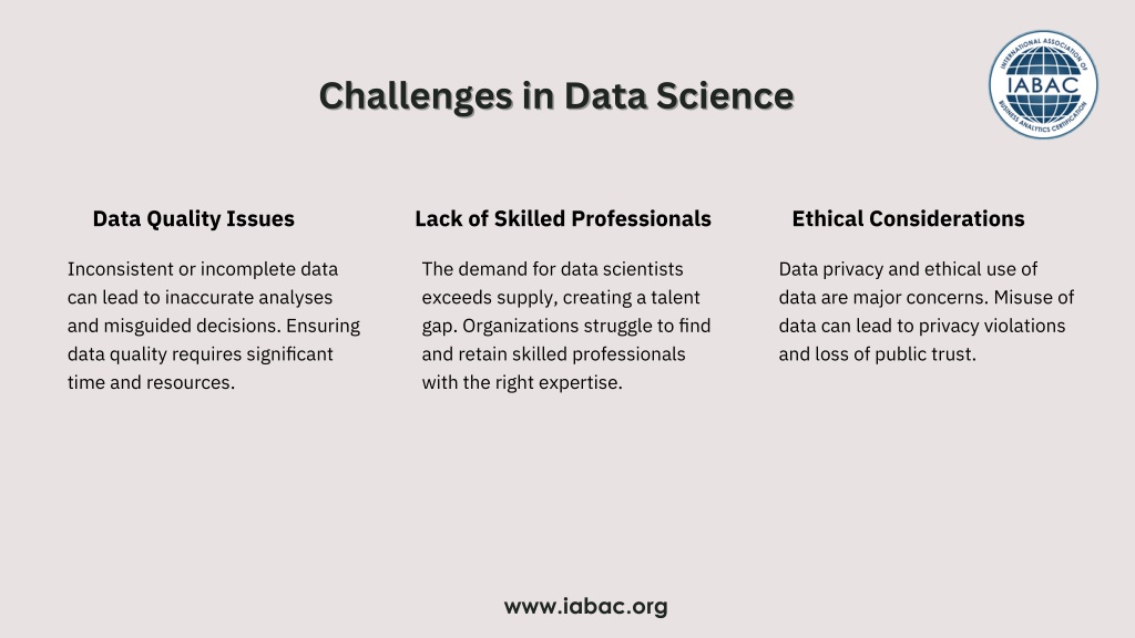 Challenges in Data Science Challenges in Data Science Data Quality Issues Lack of Skilled Professionals Ethical Considerations Inconsistent or incomplete data can lead to inaccurate analyses and misguided decisions. Ensuring data quality requires significant time and resources. The demand for data scientists exceeds supply, creating a talent gap. Organizations struggle to find and retain skilled professionals with the right expertise. Data privacy and ethical use of data are major concerns. Misuse of data can lead to privacy violations and loss of public trust. www.iabac.org