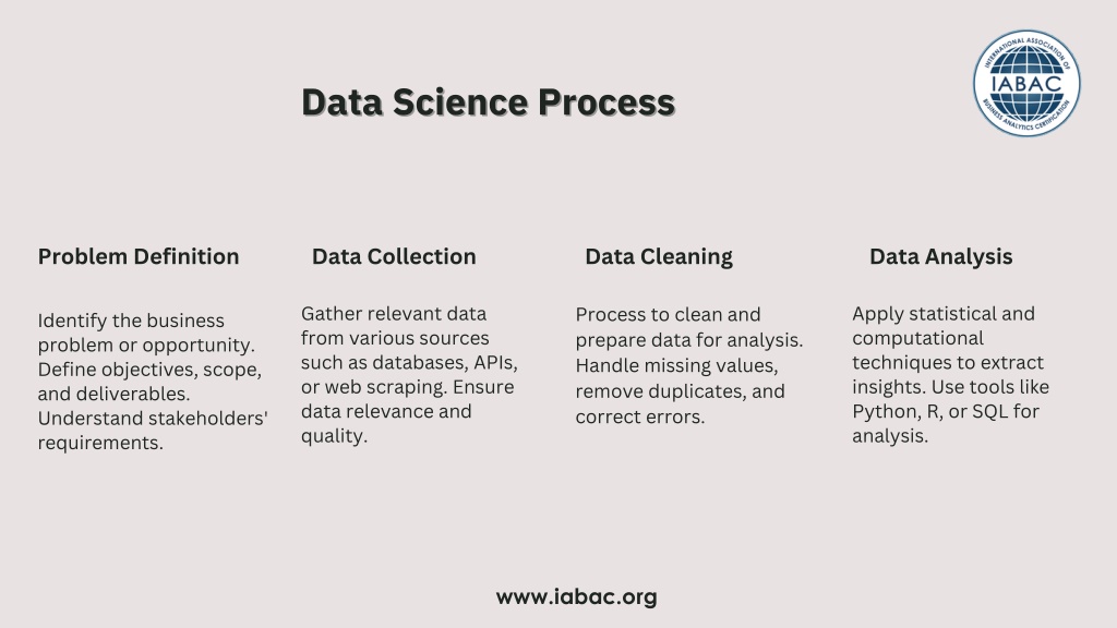 Data Science Process Data Science Process Problem Definition Data Collection Data Cleaning Data Analysis Gather relevant data from various sources such as databases, APIs, or web scraping. Ensure data relevance and quality. Apply statistical and computational techniques to extract insights. Use tools like Python, R, or SQL for analysis. Process to clean and prepare data for analysis. Handle missing values, remove duplicates, and correct errors. Identify the business problem or opportunity. Define objectives, scope, and deliverables. Understand stakeholders' requirements. www.iabac.org