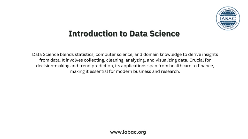 Introduction to Data Science Introduction to Data Science Data Science blends statistics, computer science, and domain knowledge to derive insights from data. It involves collecting, cleaning, analyzing, and visualizing data. Crucial for decision-making and trend prediction, its applications span from healthcare to finance, making it essential for modern business and research. www.iabac.org