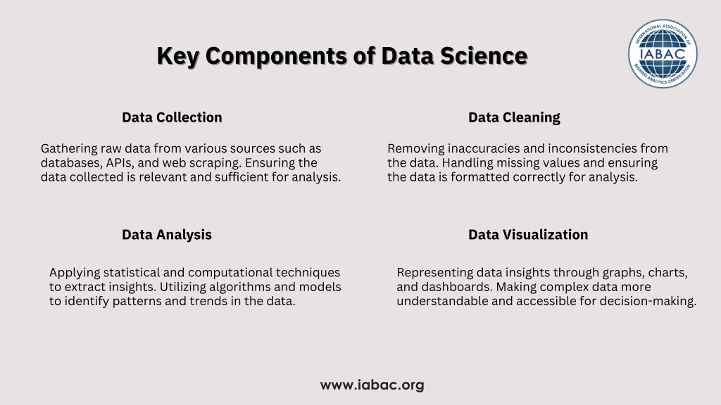 Key Components of Data Science Key Components of Data Science Data Collection Data Cleaning Gathering raw data from various sources such as databases, APIs, and web scraping. Ensuring the data collected is relevant and sufficient for analysis. Removing inaccuracies and inconsistencies from the data. Handling missing values and ensuring the data is formatted correctly for analysis. Data Analysis Data Visualization Applying statistical and computational techniques to extract insights. Utilizing algorithms and models to identify patterns and trends in the data. Representing data insights through graphs, charts, and dashboards. Making complex data more understandable and accessible for decision-making. www.iabac.org