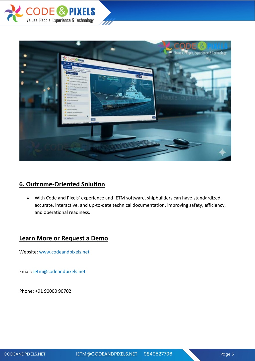 •This reduces errors in assembly, maintenance, and operation and improves knowledge retention for engineers and trainees. 4. Standardization and Version Control •Code and Pixels ensures that all units and teams use the same updated documentation, solving the issue of inconsistent or outdated information. •Multiple teams can access the same IETM simultaneously, ensuring consistency in training and operations. 5. Scalability and Cost Efficiency •Digital manuals can be deployed across multiple shipyards without printing or distribution costs. •This approach saves time, reduces human error, and increases productivity, addressing logistical challenges inherent in traditional documentation. CODEANDPIXELS.NET IETM@CODEANDPIXELS.NET 9849527706 Page 4