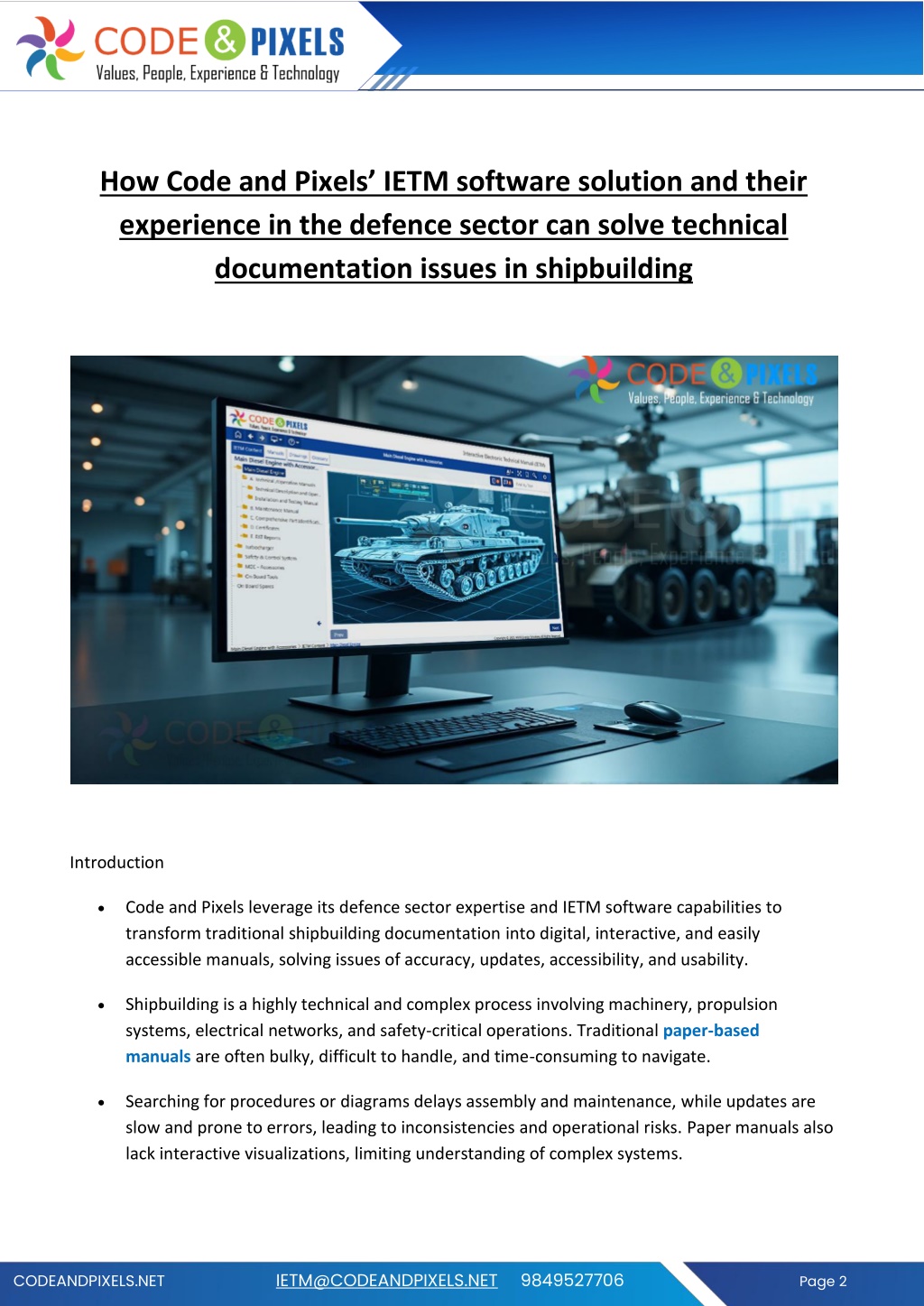 How Code and Pixels’ IETM software solution and their experience in the defence sector can solve technical documentation issues in shipbuilding Introduction •Code and Pixels leverage its defence sector expertise and IETM software capabilities to transform traditional shipbuilding documentation into digital, interactive, and easily accessible manuals, solving issues of accuracy, updates, accessibility, and usability. •Shipbuilding is a highly technical and complex process involving machinery, propulsion systems, electrical networks, and safety-critical operations. Traditional paper-based manuals are often bulky, difficult to handle, and time-consuming to navigate. •Searching for procedures or diagrams delays assembly and maintenance, while updates are slow and prone to errors, leading to inconsistencies and operational risks. Paper manuals also lack interactive visualizations, limiting understanding of complex systems. CODEANDPIXELS.NET IETM@CODEANDPIXELS.NET 9849527706 Page 2