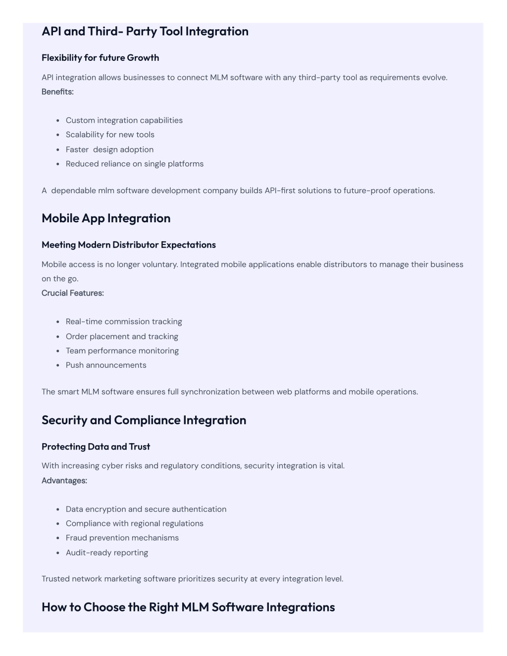 API and Third- Party Tool Integration Flexibility for future Growth API integration allows businesses to connect MLM software with any third-party tool as requirements evolve. Benefits: Custom integration capabilities Scalability for new tools Faster design adoption Reduced reliance on single platforms A dependable mlm software development company builds API-first solutions to future-proof operations. Mobile App Integration Meeting Modern Distributor Expectations Mobile access is no longer voluntary. Integrated mobile applications enable distributors to manage their business on the go. Crucial Features: Real-time commission tracking Order placement and tracking Team performance monitoring Push announcements The smart MLM software ensures full synchronization between web platforms and mobile operations. Security and Compliance Integration Protecting Data and Trust With increasing cyber risks and regulatory conditions, security integration is vital. Advantages: Data encryption and secure authentication Compliance with regional regulations Fraud prevention mechanisms Audit-ready reporting Trusted network marketing software prioritizes security at every integration level. How to Choose the Right MLM Software Integrations