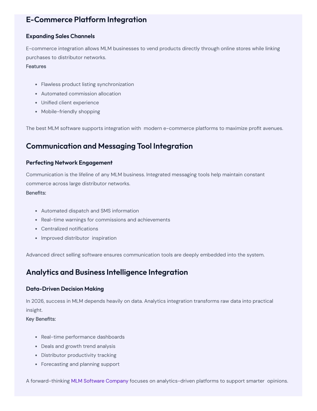 E-Commerce Platform Integration Expanding Sales Channels E-commerce integration allows MLM businesses to vend products directly through online stores while linking purchases to distributor networks. Features Flawless product listing synchronization Automated commission allocation Unified client experience Mobile-friendly shopping The best MLM software supports integration with modern e-commerce platforms to maximize profit avenues. Communication and Messaging Tool Integration Perfecting Network Engagement Communication is the lifeline of any MLM business. Integrated messaging tools help maintain constant commerce across large distributor networks. Benefits: Automated dispatch and SMS information Real-time warnings for commissions and achievements Centralized notifications Improved distributor inspiration Advanced direct selling software ensures communication tools are deeply embedded into the system. Analytics and Business Intelligence Integration Data-Driven Decision Making In 2026, success in MLM depends heavily on data. Analytics integration transforms raw data into practical insight. Key Benefits: Real-time performance dashboards Deals and growth trend analysis Distributor productivity tracking Forecasting and planning support A forward-thinking MLM Software Company focuses on analytics-driven platforms to support smarter opinions.
