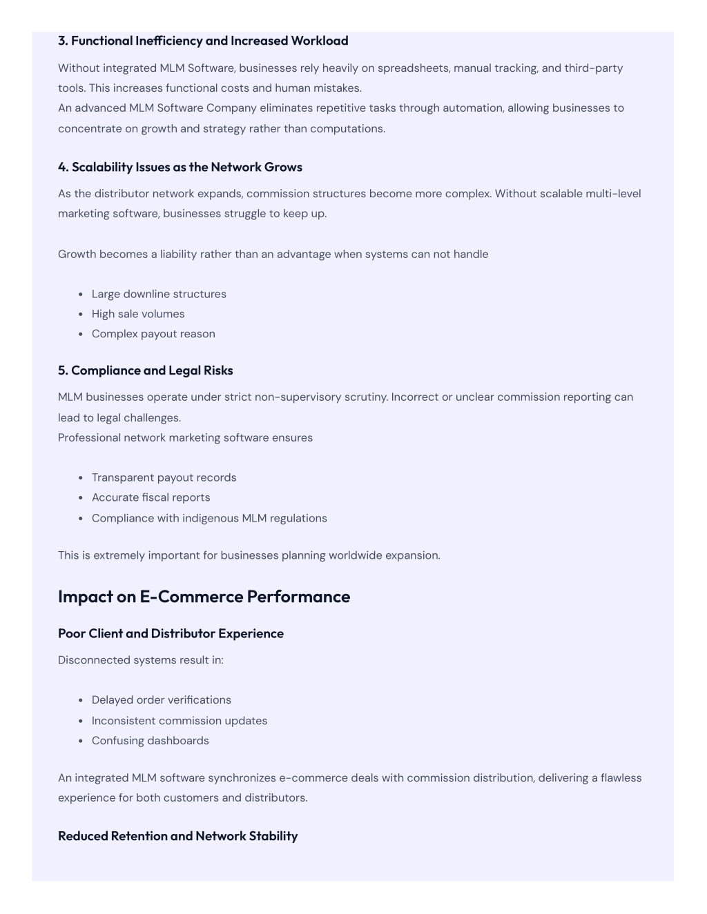 3. Functional Inefficiency and Increased Workload Without integrated MLM Software, businesses rely heavily on spreadsheets, manual tracking, and third-party tools. This increases functional costs and human mistakes. An advanced MLM Software Company eliminates repetitive tasks through automation, allowing businesses to concentrate on growth and strategy rather than computations. 4. Scalability Issues as the Network Grows As the distributor network expands, commission structures become more complex. Without scalable multi-level marketing software, businesses struggle to keep up. Growth becomes a liability rather than an advantage when systems can not handle Large downline structures High sale volumes Complex payout reason 5. Compliance and Legal Risks MLM businesses operate under strict non-supervisory scrutiny. Incorrect or unclear commission reporting can lead to legal challenges. Professional network marketing software ensures Transparent payout records Accurate fiscal reports Compliance with indigenous MLM regulations This is extremely important for businesses planning worldwide expansion. Impact on E-Commerce Performance Poor Client and Distributor Experience Disconnected systems result in: Delayed order verifications Inconsistent commission updates Confusing dashboards An integrated MLM software synchronizes e-commerce deals with commission distribution, delivering a flawless experience for both customers and distributors. Reduced Retention and Network Stability