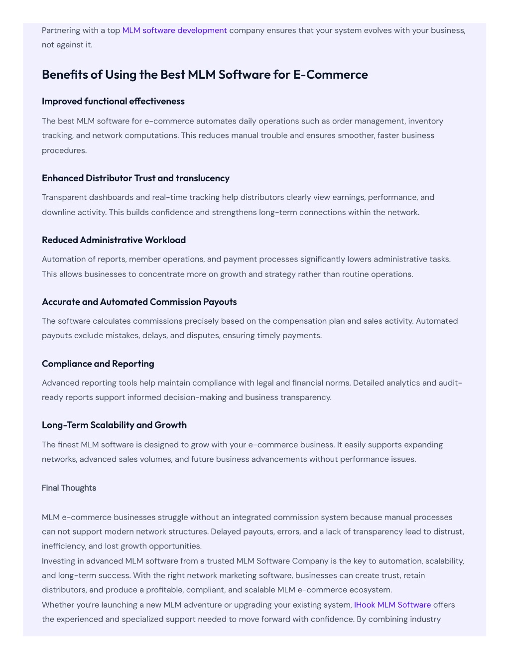 Partnering with a top MLM software development company ensures that your system evolves with your business, not against it. Benefits of Using the Best MLM Software for E-Commerce Improved functional effectiveness The best MLM software for e-commerce automates daily operations such as order management, inventory tracking, and network computations. This reduces manual trouble and ensures smoother, faster business procedures. Enhanced Distributor Trust and translucency Transparent dashboards and real-time tracking help distributors clearly view earnings, performance, and downline activity. This builds confidence and strengthens long-term connections within the network. Reduced Administrative Workload Automation of reports, member operations, and payment processes significantly lowers administrative tasks. This allows businesses to concentrate more on growth and strategy rather than routine operations. Accurate and Automated Commission Payouts The software calculates commissions precisely based on the compensation plan and sales activity. Automated payouts exclude mistakes, delays, and disputes, ensuring timely payments. Compliance and Reporting Advanced reporting tools help maintain compliance with legal and financial norms. Detailed analytics and audit- ready reports support informed decision-making and business transparency. Long-Term Scalability and Growth The finest MLM software is designed to grow with your e-commerce business. It easily supports expanding networks, advanced sales volumes, and future business advancements without performance issues. Final Thoughts MLM e-commerce businesses struggle without an integrated commission system because manual processes can not support modern network structures. Delayed payouts, errors, and a lack of transparency lead to distrust, inefficiency, and lost growth opportunities. Investing in advanced MLM software from a trusted MLM Software Company is the key to automation, scalability, and long-term success. With the right network marketing software, businesses can create trust, retain distributors, and produce a profitable, compliant, and scalable MLM e-commerce ecosystem. Whether you’re launching a new MLM adventure or upgrading your existing system, IHook MLM Software offers the experienced and specialized support needed to move forward with confidence. By combining industry