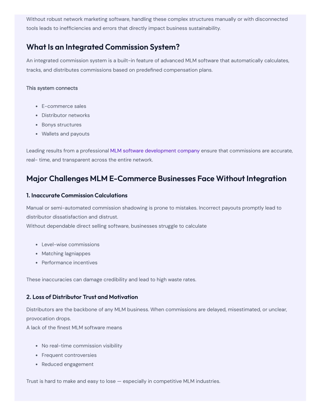Without robust network marketing software, handling these complex structures manually or with disconnected tools leads to inefficiencies and errors that directly impact business sustainability. What Is an Integrated Commission System? An integrated commission system is a built-in feature of advanced MLM software that automatically calculates, tracks, and distributes commissions based on predefined compensation plans. This system connects E-commerce sales Distributor networks Bonys structures Wallets and payouts Leading results from a professional MLM software development company ensure that commissions are accurate, real- time, and transparent across the entire network. Major Challenges MLM E-Commerce Businesses Face Without Integration 1. Inaccurate Commission Calculations Manual or semi-automated commission shadowing is prone to mistakes. Incorrect payouts promptly lead to distributor dissatisfaction and distrust. Without dependable direct selling software, businesses struggle to calculate Level-wise commissions Matching lagniappes Performance incentives These inaccuracies can damage credibility and lead to high waste rates. 2. Loss of Distributor Trust and Motivation Distributors are the backbone of any MLM business. When commissions are delayed, misestimated, or unclear, provocation drops. A lack of the finest MLM software means No real-time commission visibility Frequent controversies Reduced engagement Trust is hard to make and easy to lose — especially in competitive MLM industries.