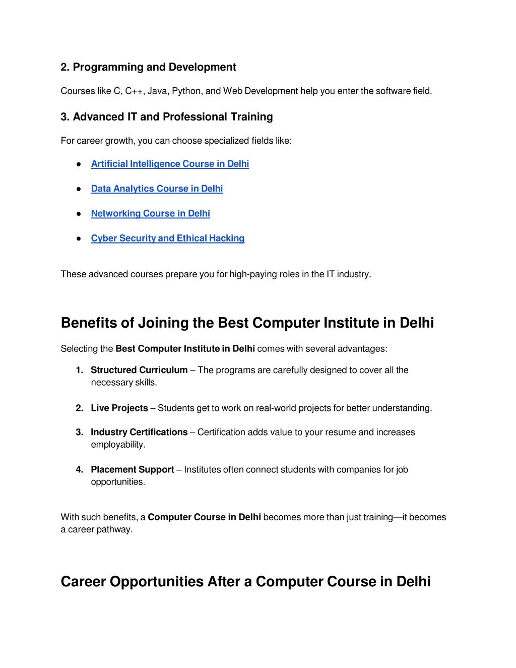 ProgrammingandDevelopment • CourseslikeC,C++,Java,Python,andWebDevelopmenthelpyouenterthesoftwarefield. • AdvancedITandProfessionalTraining • Forcareergrowth,youcanchoosespecializedfieldslike: • ArtificialIntelligenceCourseinDelhi • DataAnalyticsCourseinDelhi • NetworkingCourseinDelhi • CyberSecurityandEthicalHacking • Theseadvancedcoursesprepareyouforhigh-payingrolesintheITindustry. BenefitsofJoiningtheBestComputerInstituteinDelhi SelectingtheBestComputerInstituteinDelhicomeswithseveraladvantages: StructuredCurriculum–Theprogramsarecarefullydesignedtocoverall the necessaryskills. LiveProjects–Studentsgettoworkonreal-worldprojectsforbetterunderstanding. IndustryCertifications–Certificationaddsvaluetoyourresumeandincreases employability. PlacementSupport–Institutesoftenconnectstudentswithcompaniesforjob opportunities. Withsuchbenefits,aComputerCourseinDelhibecomesmorethanjusttraining—itbecomes acareerpathway. CareerOpportunitiesAfteraComputerCourseinDelhi