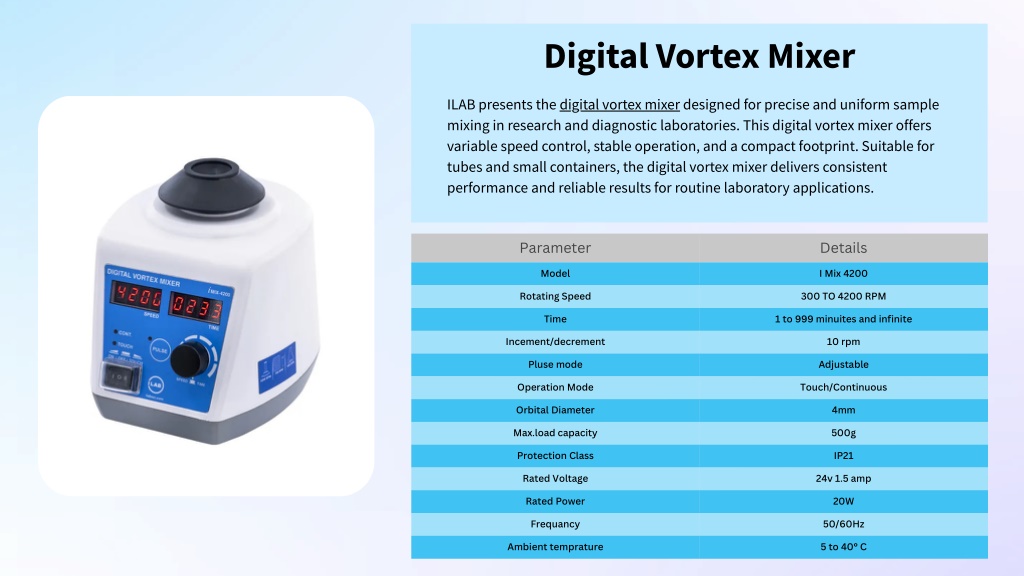 Digital Vortex Mixer ILAB presents the digital vortex mixer designed for precise and uniform sample mixing in research and diagnostic laboratories. This digital vortex mixer offers variable speed control, stable operation, and a compact footprint. Suitable for tubes and small containers, the digital vortex mixer delivers consistent performance and reliable results for routine laboratory applications. Parameter Details Model I Mix 4200 Rotating Speed 300 TO 4200 RPM Time 1 to 999 minuites and infinite Incement/decrement 10 rpm Pluse mode Adjustable Operation Mode Touch/Continuous Orbital Diameter 4mm Max.load capacity 500g Protection Class IP21 Rated Voltage 24v 1.5 amp Rated Power 20W Frequancy 50/60Hz Ambient temprature 5 to 40° C