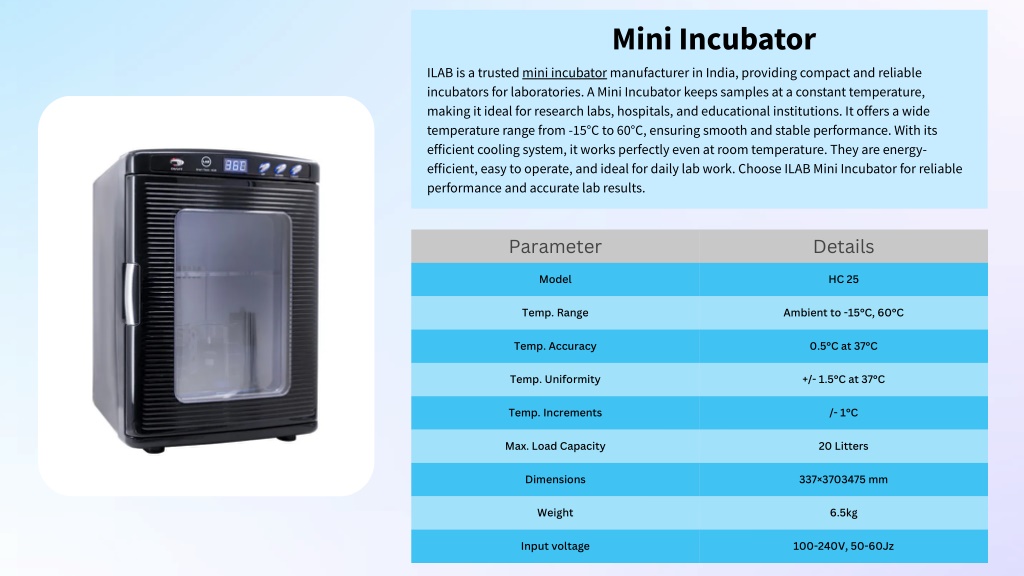 Mini Incubator ILAB is a trusted mini incubator manufacturer in India, providing compact and reliable incubators for laboratories. A Mini Incubator keeps samples at a constant temperature, making it ideal for research labs, hospitals, and educational institutions. It offers a wide temperature range from -15°C to 60°C, ensuring smooth and stable performance. With its efficient cooling system, it works perfectly even at room temperature. They are energy- efficient, easy to operate, and ideal for daily lab work. Choose ILAB Mini Incubator for reliable performance and accurate lab results. Parameter Details Model HC 25 Temp. Range Ambient to -15°C, 60°C Temp. Accuracy 0.5°C at 37°C Temp. Uniformity +/- 1.5°C at 37°C Temp. Increments /- 1°C Max. Load Capacity 20 Litters Dimensions 337×3703475 mm Weight 6.5kg Input voltage 100-240V, 50-60Jz