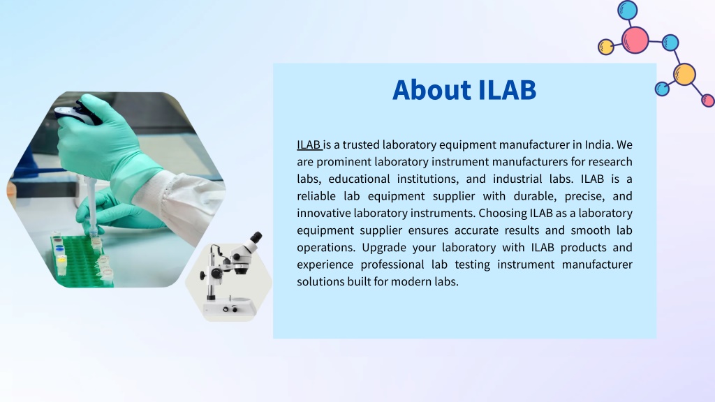 About ILAB ILAB is a trusted laboratory equipment manufacturer in India. We are prominent laboratory instrument manufacturers for research labs, educational institutions, and industrial labs. ILAB is a reliable lab equipment supplier with durable, precise, and innovative laboratory instruments. Choosing ILAB as a laboratory equipment supplier ensures accurate results and smooth lab operations. Upgrade your laboratory with ILAB products and experience professional lab testing instrument manufacturer solutions built for modern labs.
