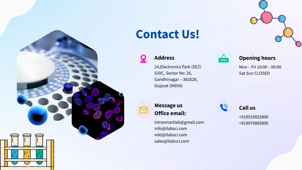 Contact Us! Address Opening hours 24,Electronics Park (SEZ) GIDC, Sector No: 26, Gandhinagar – 382028, Gujarat (INDIA) Mon – Fri 10:00 – 06:00 Sat Sun CLOSED Message us Office email: Call us +919510822800 +919979883800 intrasmartlab@gmail.com info@ilabsci.com mkt@ilabsci.com sales@ilabsci.com