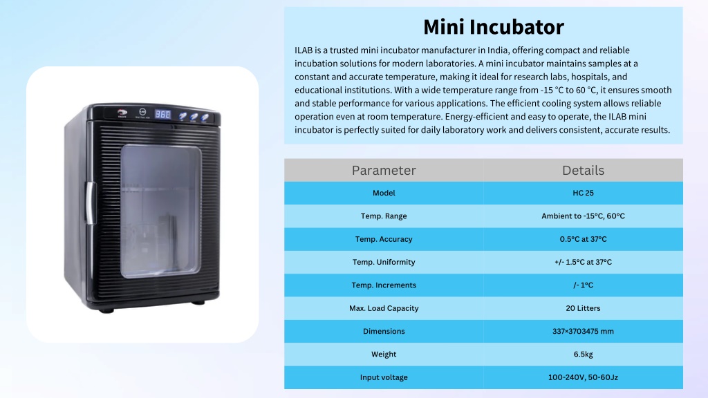 Mini Incubator ILAB is a trusted mini incubator manufacturer in India, offering compact and reliable incubation solutions for modern laboratories. A mini incubator maintains samples at a constant and accurate temperature, making it ideal for research labs, hospitals, and educational institutions. With a wide temperature range from -15 °C to 60 °C, it ensures smooth and stable performance for various applications. The efficient cooling system allows reliable operation even at room temperature. Energy-efficient and easy to operate, the ILAB mini incubator is perfectly suited for daily laboratory work and delivers consistent, accurate results. Parameter Details Model HC 25 Temp. Range Ambient to -15°C, 60°C Temp. Accuracy 0.5°C at 37°C Temp. Uniformity +/- 1.5°C at 37°C Temp. Increments /- 1°C Max. Load Capacity 20 Litters Dimensions 337×3703475 mm Weight 6.5kg Input voltage 100-240V, 50-60Jz