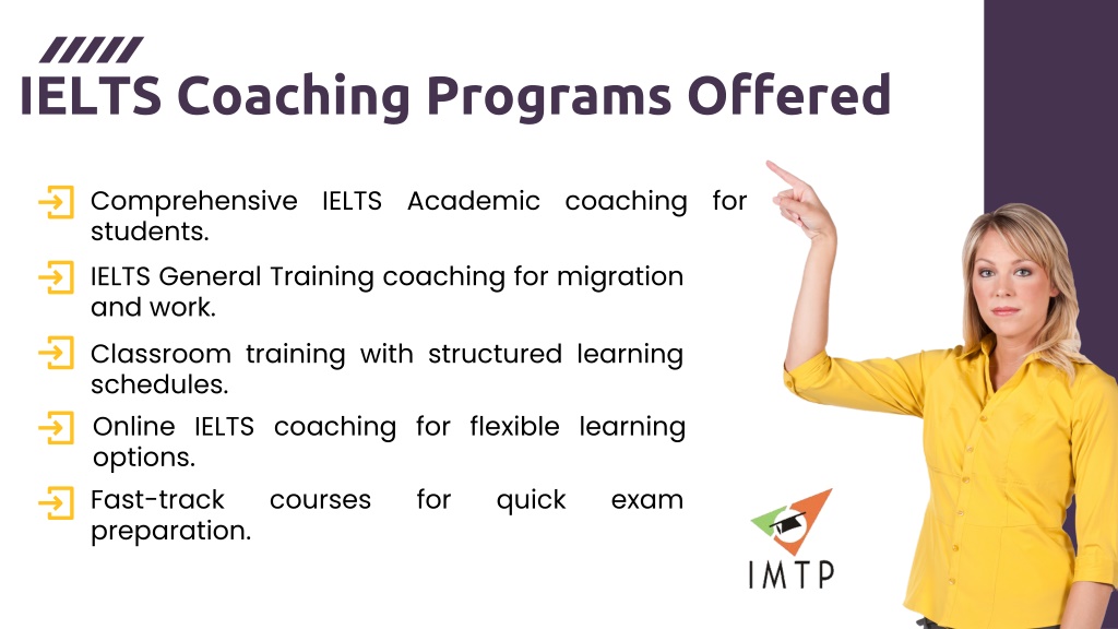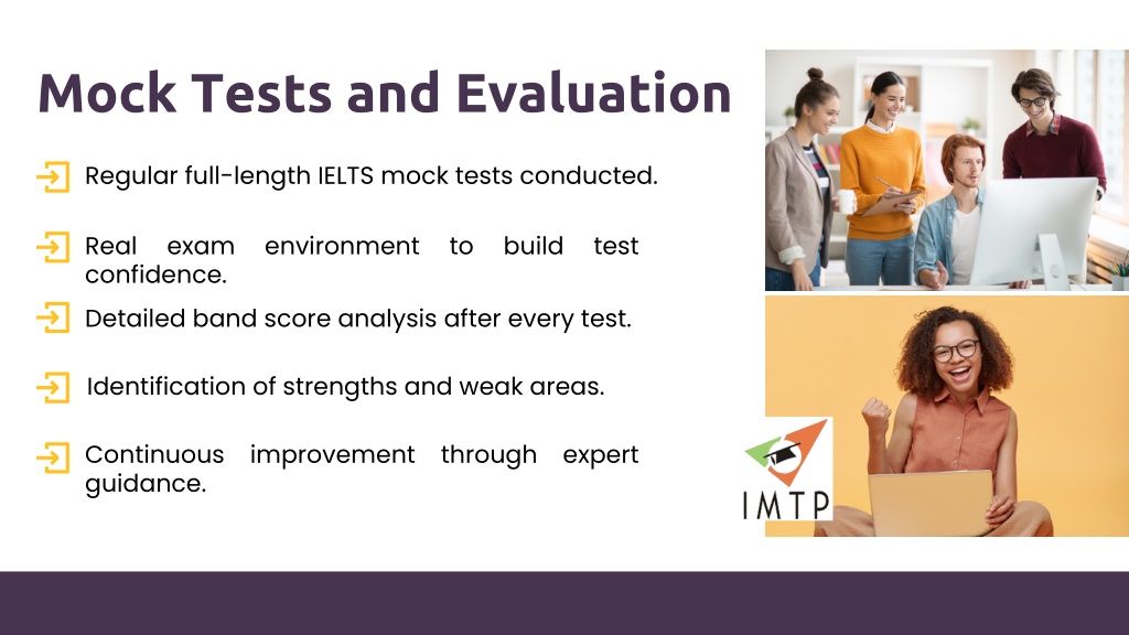 4. Why Choose IMTP Consultants Experienced IELTS trainers with in-depth exam knowledge. Small batch sizes ensure individual attention and clarity. Updated IELTS study materials aligned with latest exam patterns. Regular assessments progress and improvement. High success rate in IELTS band score achievements. to track student