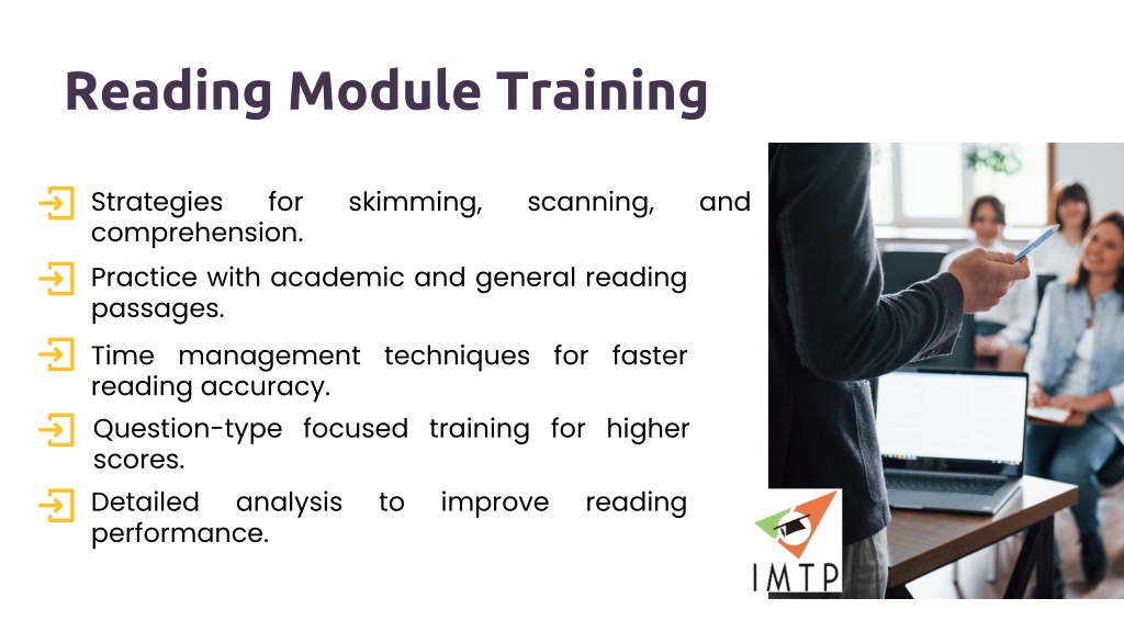 9. Reading Module Training Strategies comprehension. Practice with academic and general reading passages. Time management techniques for faster reading accuracy. Question-type focused training for higher scores. Detailed analysis to performance. for skimming, scanning, and improve reading