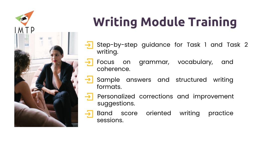 10. Writing Module Training Step-by-step guidance for Task 1 and Task 2 writing. Focus on grammar, coherence. Sample answers and structured writing formats. Personalized corrections and improvement suggestions. Band score oriented sessions. vocabulary, and writing practice