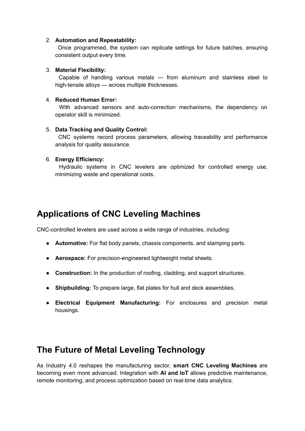 2. Automation and Repeatability: Once programmed, the system can replicate settings for future batches, ensuring consistent output every time. 3. Material Flexibility: Capable of handling various metals — from aluminum and stainless steel to high-tensile alloys — across multiple thicknesses. 4. Reduced Human Error: With advanced sensors and auto-correction mechanisms, the dependency on operator skill is minimized. 5. Data Tracking and Quality Control: CNC systems record process parameters, allowing traceability and performance analysis for quality assurance. 6. Energy Efficiency: Hydraulic systems in CNC levelers are optimized for controlled energy use, minimizing waste and operational costs. Applications of CNC Leveling Machines CNC-controlled levelers are used across a wide range of industries, including: ● Automotive: For flat body panels, chassis components, and stamping parts. ● Aerospace: For precision-engineered lightweight metal sheets. ● Construction: In the production of roofing, cladding, and support structures. ● Shipbuilding: To prepare large, flat plates for hull and deck assemblies. ● Electrical Equipment Manufacturing: For enclosures and precision metal housings. The Future of Metal Leveling Technology As Industry 4.0 reshapes the manufacturing sector, smart CNC Leveling Machines are becoming even more advanced. Integration with AI and IoT allows predictive maintenance, remote monitoring, and process optimization based on real-time data analytics.