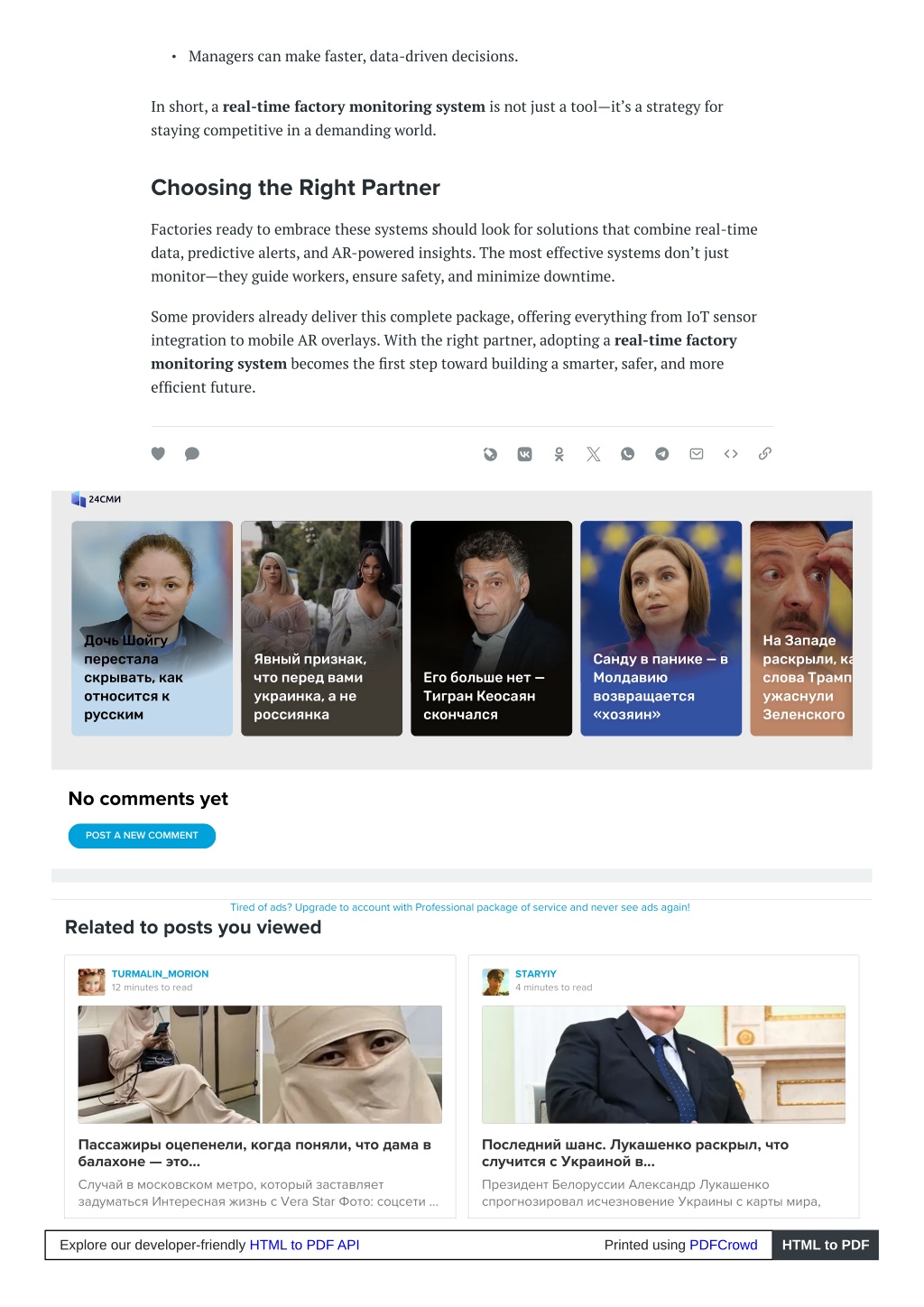 Managers can make faster, data-driven decisions. In short, a real-time factory monitoring system is not just a tool—it’s a strategy for staying competitive in a demanding world. Choosing the Right Partner Factories ready to embrace these systems should look for solutions that combine real-time data, predictive alerts, and AR-powered insights. The most effective systems don’t just monitor—they guide workers, ensure safety, and minimize downtime. Some providers already deliver this complete package, offering everything from IoT sensor integration to mobile AR overlays. With the right partner, adopting a real-time factory monitoring system becomes the first step toward building a smarter, safer, and more efficient future. ДочьШойгу ДочьШойгу перестала перестала скрывать, как скрывать, как относитсяк относитсяк русским русским НаЗападе НаЗападе раскрыли, ка раскрыли, ка словаТрамп словаТрамп ужаснули ужаснули Зеленского Зеленского Явныйпризнак, Явныйпризнак, чтопередвами чтопередвами украинка, ане украинка, ане россиянка россиянка Сандувпанике — в Сандувпанике — в Молдавию Молдавию возвращается возвращается «хозяин» «хозяин» Егобольшенет — Егобольшенет — ТигранКеосаян ТигранКеосаян скончался скончался No comments yet POST A NEW COMMENT Tired of ads? Upgrade to account with Professional package of service and never see ads again! Related to posts you viewed TURMALIN_MORION STARYIY 12 minutes to read 4 minutes to read Пассажиры оцепенели, когда поняли, что дама в балахоне — это... Последний шанс. Лукашенко раскрыл, что случится с Украиной в... Случай в московском метро, который заставляет задуматься Интересная жизнь с Vera Star Фото: соцсети ... Президент Белоруссии Александр Лукашенко спрогнозировал исчезновение Украины с карты мира, Explore our developer-friendly HTML to PDF API Printed using PDFCrowd HTML to PDF