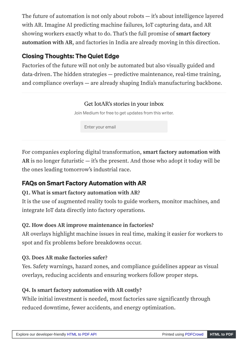 The future of automation is not only about robots — it’s about intelligence layered with AR. Imagine AI predicting machine failures, IoT capturing data, and AR showing workers exactly what to do. That’s the full promise of smart factory automation with AR, and factories in India are already moving in this direction. Closing Thoughts: The Quiet Edge Factories of the future will not only be automated but also visually guided and data-driven. The hidden strategies — predictive maintenance, real-time training, and compliance overlays — are already shaping India’s manufacturing backbone. Get IotAR’s stories in your inbox Join Medium for free to get updates from this writer. Enter your email For companies exploring digital transformation, smart factory automation with AR is no longer futuristic — it’s the present. And those who adopt it today will be the ones leading tomorrow’s industrial race. FAQs on Smart Factory Automation with AR Q1. What is smart factory automation with AR? It is the use of augmented reality tools to guide workers, monitor machines, and integrate IoT data directly into factory operations. Q2. How does AR improve maintenance in factories? AR overlays highlight machine issues in real time, making it easier for workers to spot and fix problems before breakdowns occur. Q3. Does AR make factories safer? Yes. Safety warnings, hazard zones, and compliance guidelines appear as visual overlays, reducing accidents and ensuring workers follow proper steps. Q4. Is smart factory automation with AR costly? While initial investment is needed, most factories save significantly through reduced downtime, fewer accidents, and energy optimization. Explore our developer-friendly HTML to PDF API Printed using PDFCrowd HTML to PDF