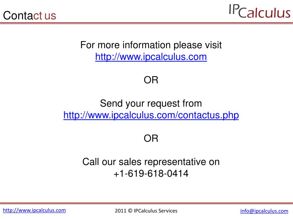 Contactus For more information please visit http://www.ipcalculus.com OR Send your request from http://www.ipcalculus.com/contactus.php OR Call our sales representative on +1-619-618-0414 http://www.ipcalculus.com 2011 © IPCalculus Services info@ipcalculus.com