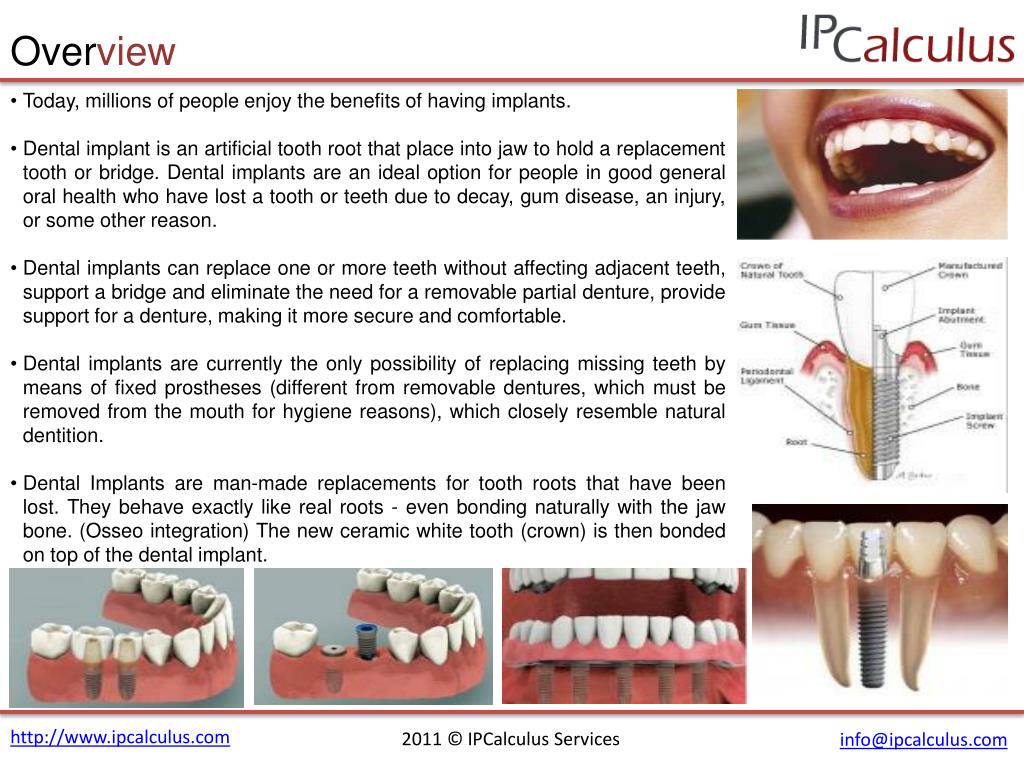 Overview • Today, millions of people enjoy the benefits of having implants. • Dental implant is an artificial tooth root that place into jaw to hold a replacement tooth or bridge. Dental implants are an ideal option for people in good general oral health who have lost a tooth or teeth due to decay, gum disease, an injury, or some other reason. • Dental implants can replace one or more teeth without affecting adjacent teeth, support a bridge and eliminate the need for a removable partial denture, provide support for a denture, making it more secure and comfortable. • Dental implants are currently the only possibility of replacing missing teeth by means of fixed prostheses (different from removable dentures, which must be removed from the mouth for hygiene reasons), which closely resemble natural dentition. • Dental Implants are man-made replacements for tooth roots that have been lost. They behave exactly like real roots - even bonding naturally with the jaw bone. (Osseo integration) The new ceramic white tooth (crown) is then bonded on top of the dental implant. http://www.ipcalculus.com 2011 © IPCalculus Services info@ipcalculus.com