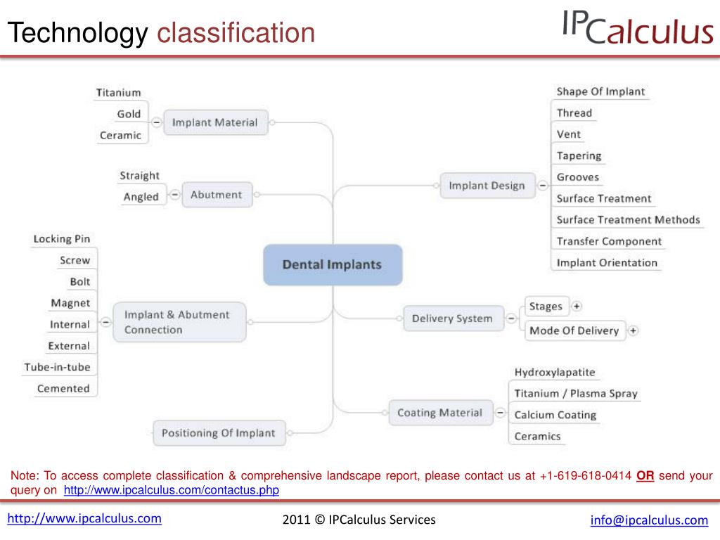 Dental Implant patent landscape report contains patenting activity by top assignees, top university/research institute, by publication year, by application year, by priority year, by top IPC class, by top US class, and geographical patenting activity. For more details send your request on info@ipcalculus.com OR contact us on +1-619-618-0414