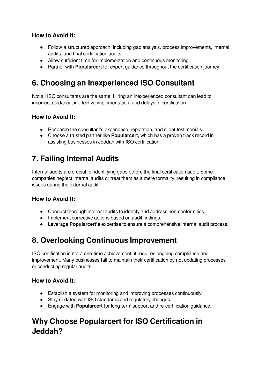 HowtoAvoidIt: • Followastructuredapproach,includinggapanalysis,processimprovements,internal audits,andfinalcertificationaudits. • Allowsufficienttimeforimplementationandcontinuousmonitoring. • PartnerwithPopularcertforexpertguidance throughoutthe certificationjourney. • ChoosinganInexperiencedISOConsultant • NotallISOconsultantsarethesame.Hiringaninexperiencedconsultantcanlead to incorrectguidance,ineffectiveimplementation,anddelaysincertification. • HowtoAvoidIt: • Researchtheconsultant’sexperience,reputation,andclienttestimonials. • ChooseatrustedpartnerlikePopularcert,whichhasaproventrackrecordin assistingbusinessesinJeddahwithISOcertification. • FailingInternalAudits • Internalauditsarecrucialforidentifyinggapsbeforethefinalcertificationaudit.Some companiesneglectinternalauditsortreatthemasamereformality,resultingincompliance issuesduringtheexternalaudit. • HowtoAvoidIt: • Conductthoroughinternalauditstoidentifyandaddressnon-conformities. • Implementcorrectiveactionsbasedonauditfindings. • LeveragePopularcert’sexpertisetoensureacomprehensiveinternalauditprocess. • OverlookingContinuousImprovement • ISOcertification isnota one-timeachievement; itrequiresongoing compliance and improvement. Many businessesfailtomaintain theircertification bynotupdating processes orconductingregularaudits. • HowtoAvoidIt: • Establishasystemformonitoringandimprovingprocessescontinuously. • StayupdatedwithISOstandardsandregulatorychanges. • EngagewithPopularcertforlong-termsupportandre-certificationguidance. • WhyChoosePopularcertforISOCertificationin Jeddah?