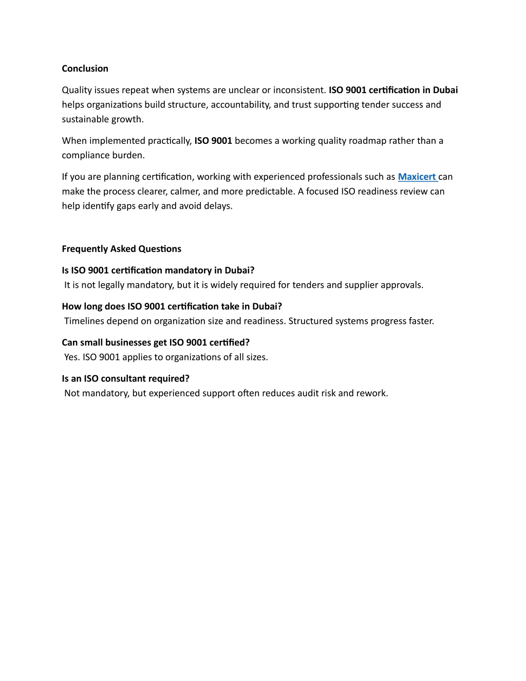 Conclusion Quality issues repeat when systems are unclear or inconsistent. ISO 9001 certification in Dubai helps organizations build structure, accountability, and trust supporting tender success and sustainable growth. When implemented practically, ISO 9001 becomes a working quality roadmap rather than a compliance burden. If you are planning certification, working with experienced professionals such as Maxicert can make the process clearer, calmer, and more predictable. A focused ISO readiness review can help identify gaps early and avoid delays. Frequently Asked Questions Is ISO 9001 certification mandatory in Dubai? It is not legally mandatory, but it is widely required for tenders and supplier approvals. How long does ISO 9001 certification take in Dubai? Timelines depend on organization size and readiness. Structured systems progress faster. Can small businesses get ISO 9001 certified? Yes. ISO 9001 applies to organizations of all sizes. Is an ISO consultant required? Not mandatory, but experienced support often reduces audit risk and rework.