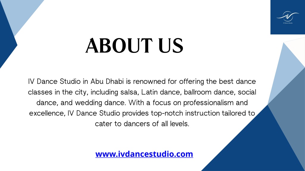 2. ABOUT US IV Dance Studio in Abu Dhabi is renowned for offering the best dance classes in the city, including salsa, Latin dance, ballroom dance, social dance, and wedding dance. With a focus on professionalism and excellence, IV Dance Studio provides top-notch instruction tailored to cater to dancers of all levels. www.ivdancestudio.com