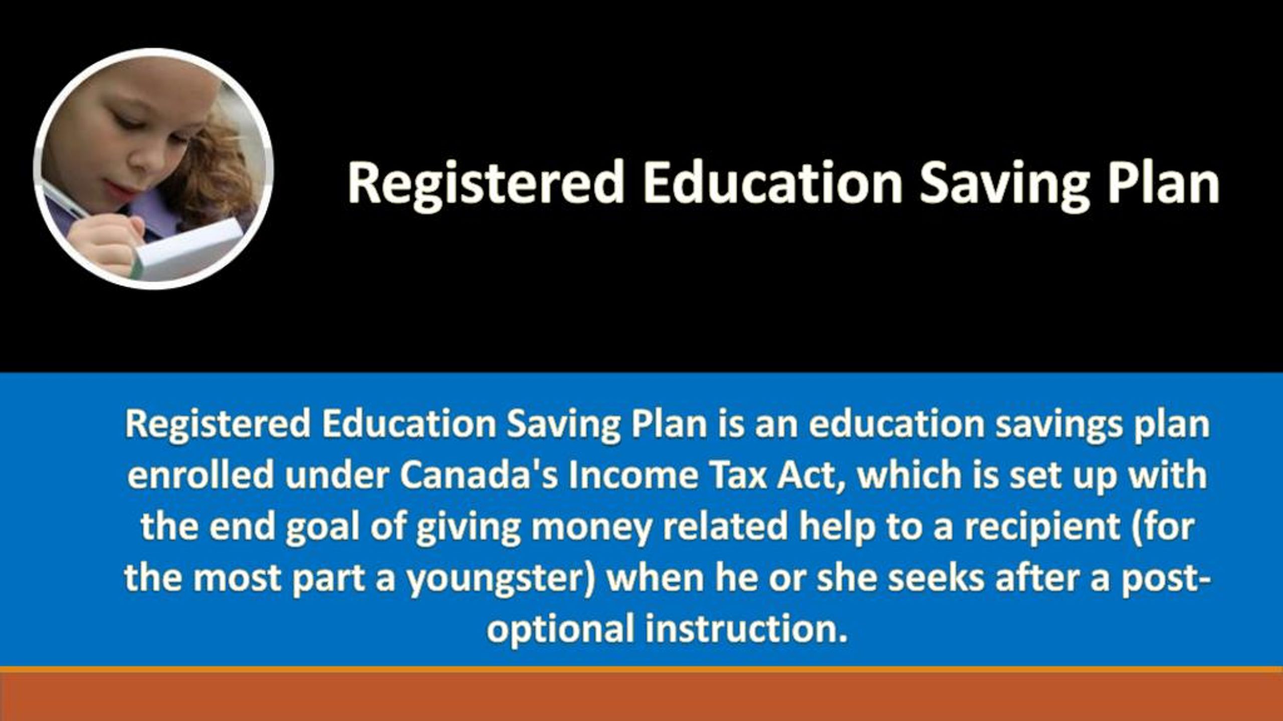 Registered Education Saving Plan Registered Education Saving Plan is an education savings plan enrolled under Canada's Income Tax Act, which is set up with the end goal of giving money related help to a recipient (for the most part a youngster) when he or she seeks after a post-optional instruction.