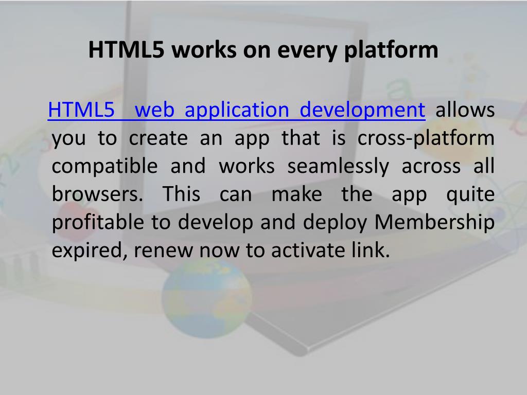 HTML5 works on every platform HTML5 web application development allows you to create an app that is cross-platform compatible and works seamlessly across all browsers. This can make the app quite profitable to develop and deploy Membership expired, renew now to activate link.