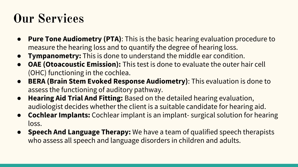 Our Services ● Pure Tone Audiometry (PTA): This is the basic hearing evaluation procedure to measure the hearing loss and to quantify the degree of hearing loss. ● Tympanometry:This is done to understand the middle ear condition. ● OAE (Otoacoustic Emission): This test is done to evaluate the outer hair cell (OHC) functioning in the cochlea. ● BERA (Brain Stem Evoked Response Audiometry): This evaluation is done to assess the functioning of auditory pathway. ● Hearing Aid Trial And Fitting: Based on the detailed hearing evaluation, audiologist decides whether the client is a suitable candidate for hearing aid. ● Cochlear Implants:Cochlear implant is an implant- surgical solution for hearing loss. ● Speech And Language Therapy: We have a team of qualified speech therapists who assess all speech and language disorders in children and adults.