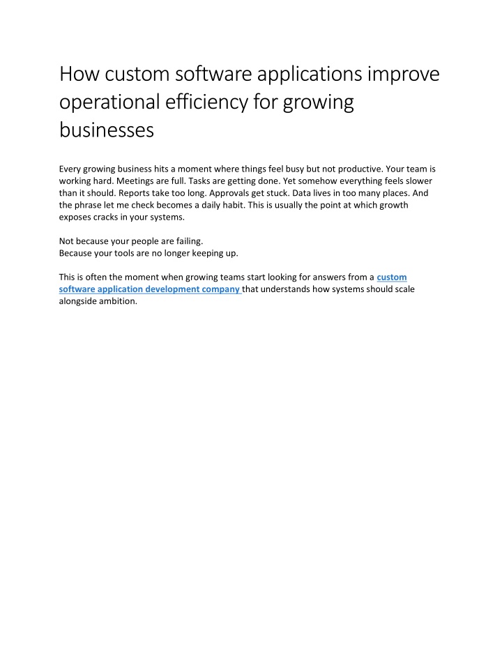 How custom software applications improve operational efficiency for growing businesses Every growing business hits a moment where things feel busy but not productive. Your team is working hard. Meetings are full. Tasks are getting done. Yet somehow everything feels slower than it should. Reports take too long. Approvals get stuck. Data lives in too many places. And the phrase let me check becomes a daily habit. This is usually the point at which growth exposes cracks in your systems. Not because your people are failing. Because your tools are no longer keeping up. This is often the moment when growing teams start looking for answers from a custom software application development company that understands how systems should scale alongside ambition.