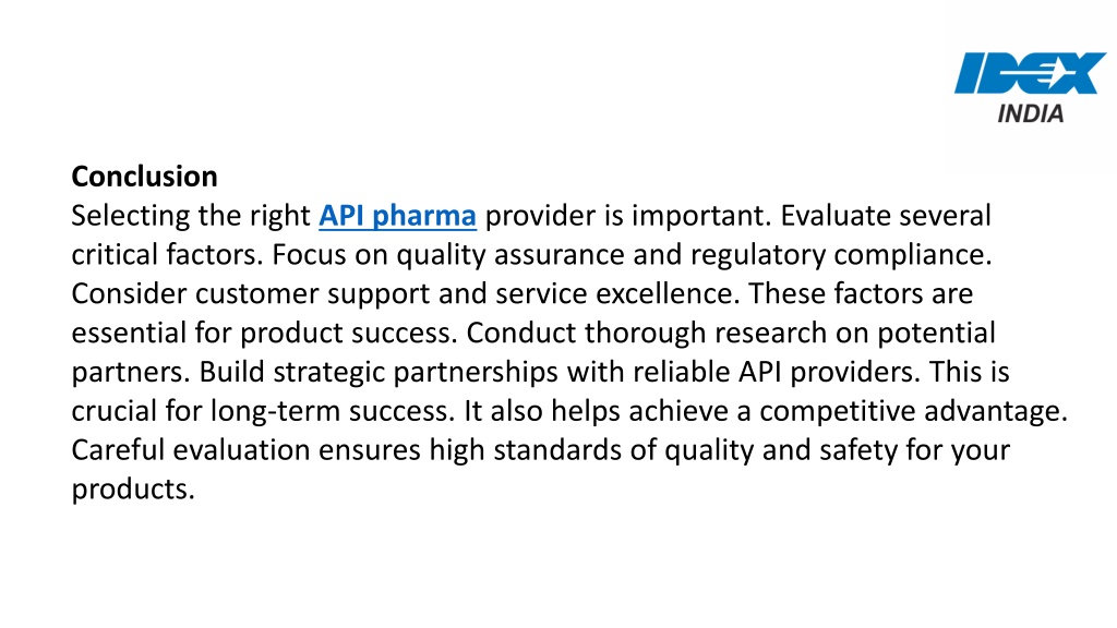 Conclusion Selecting the right API pharma provider is important. Evaluate several critical factors. Focus on quality assurance and regulatory compliance. Consider customer support and service excellence. These factors are essential for product success. Conduct thorough research on potential partners. Build strategic partnerships with reliable API providers. This is crucial for long-term success. It also helps achieve a competitive advantage. Careful evaluation ensures high standards of quality and safety for your products.