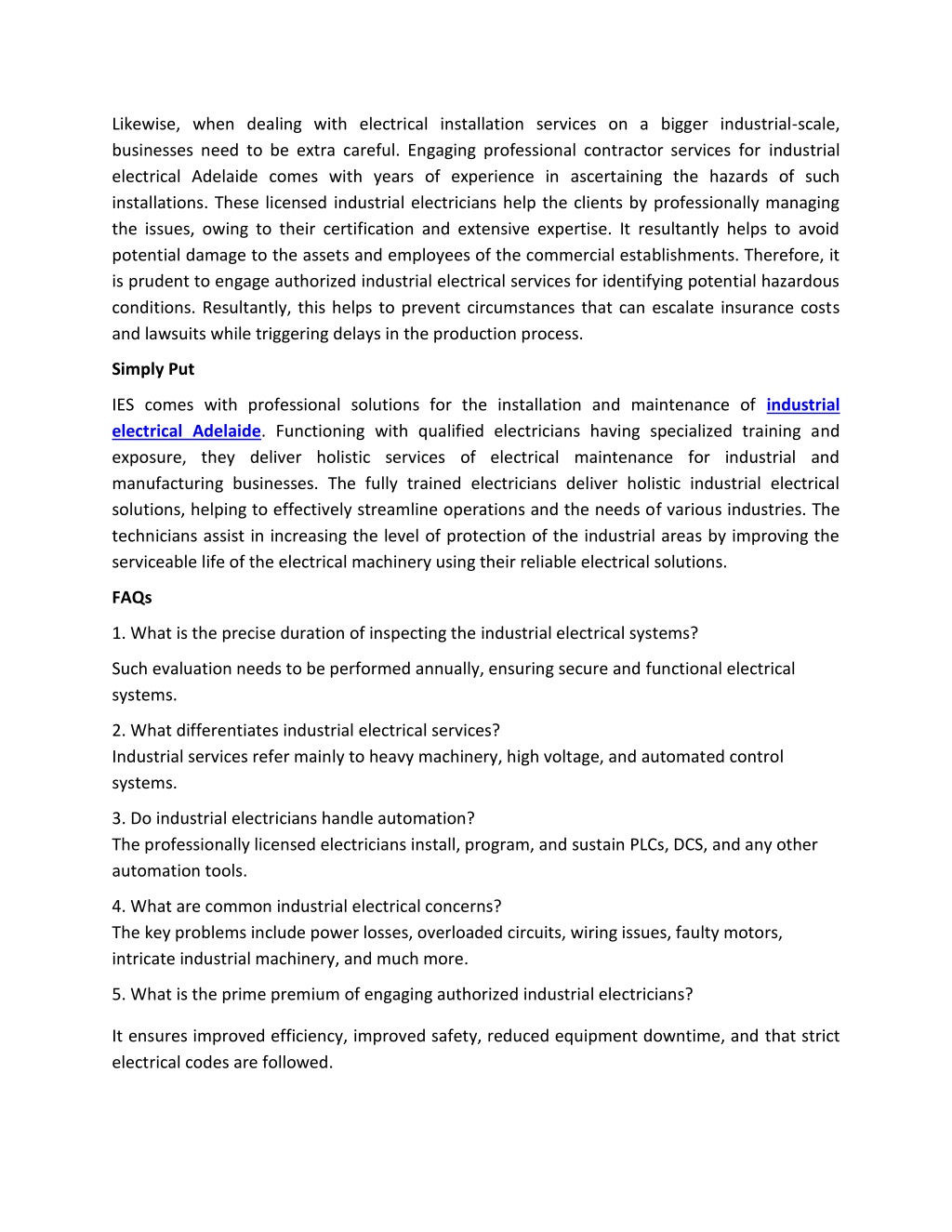 Likewise, when dealing with electrical installation services on a bigger industrial-scale, businesses need to be extra careful. Engaging professional contractor services for industrial electrical Adelaide comes with years of experience in ascertaining the hazards of such installations. These licensed industrial electricians help the clients by professionally managing the issues, owing to their certification and extensive expertise. It resultantly helps to avoid potential damage to the assets and employees of the commercial establishments. Therefore, it is prudent to engage authorized industrial electrical services for identifying potential hazardous conditions. Resultantly, this helps to prevent circumstances that can escalate insurance costs and lawsuits while triggering delays in the production process. Simply Put IES comes with professional solutions for the installation and maintenance of industrial electrical Adelaide. Functioning with qualified electricians having specialized training and exposure, they deliver holistic services of electrical maintenance for industrial and manufacturing businesses. The fully trained electricians deliver holistic industrial electrical solutions, helping to effectively streamline operations and the needs of various industries. The technicians assist in increasing the level of protection of the industrial areas by improving the serviceable life of the electrical machinery using their reliable electrical solutions. FAQs 1. What is the precise duration of inspecting the industrial electrical systems? Such evaluation needs to be performed annually, ensuring secure and functional electrical systems. 2. What differentiates industrial electrical services? Industrial services refer mainly to heavy machinery, high voltage, and automated control systems. 3. Do industrial electricians handle automation? The professionally licensed electricians install, program, and sustain PLCs, DCS, and any other automation tools. 4. What are common industrial electrical concerns? The key problems include power losses, overloaded circuits, wiring issues, faulty motors, intricate industrial machinery, and much more. 5. What is the prime premium of engaging authorized industrial electricians? It ensures improved efficiency, improved safety, reduced equipment downtime, and that strict electrical codes are followed.