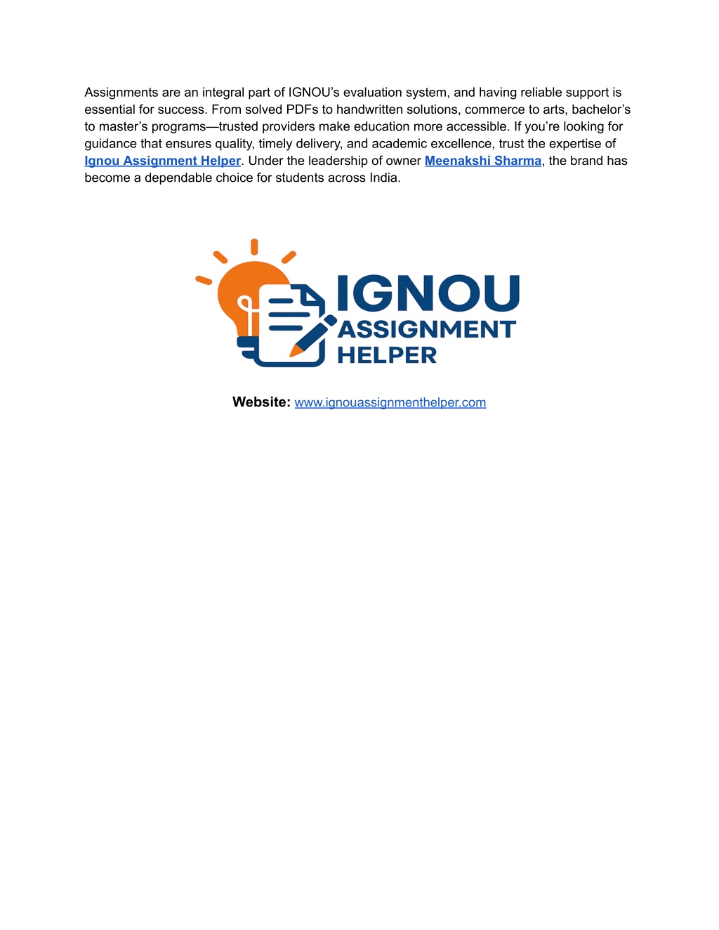 Assignments are an integral part of IGNOU’s evaluation system, and having reliable support is essential for success. From solved PDFs to handwritten solutions, commerce to arts, bachelor’s to master’s programs—trusted providers make education more accessible. If you’re looking for guidance that ensures quality, timely delivery, and academic excellence, trust the expertise of Ignou Assignment Helper. Under the leadership of owner Meenakshi Sharma, the brand has become a dependable choice for students across India. Website:www.ignouassignmenthelper.com