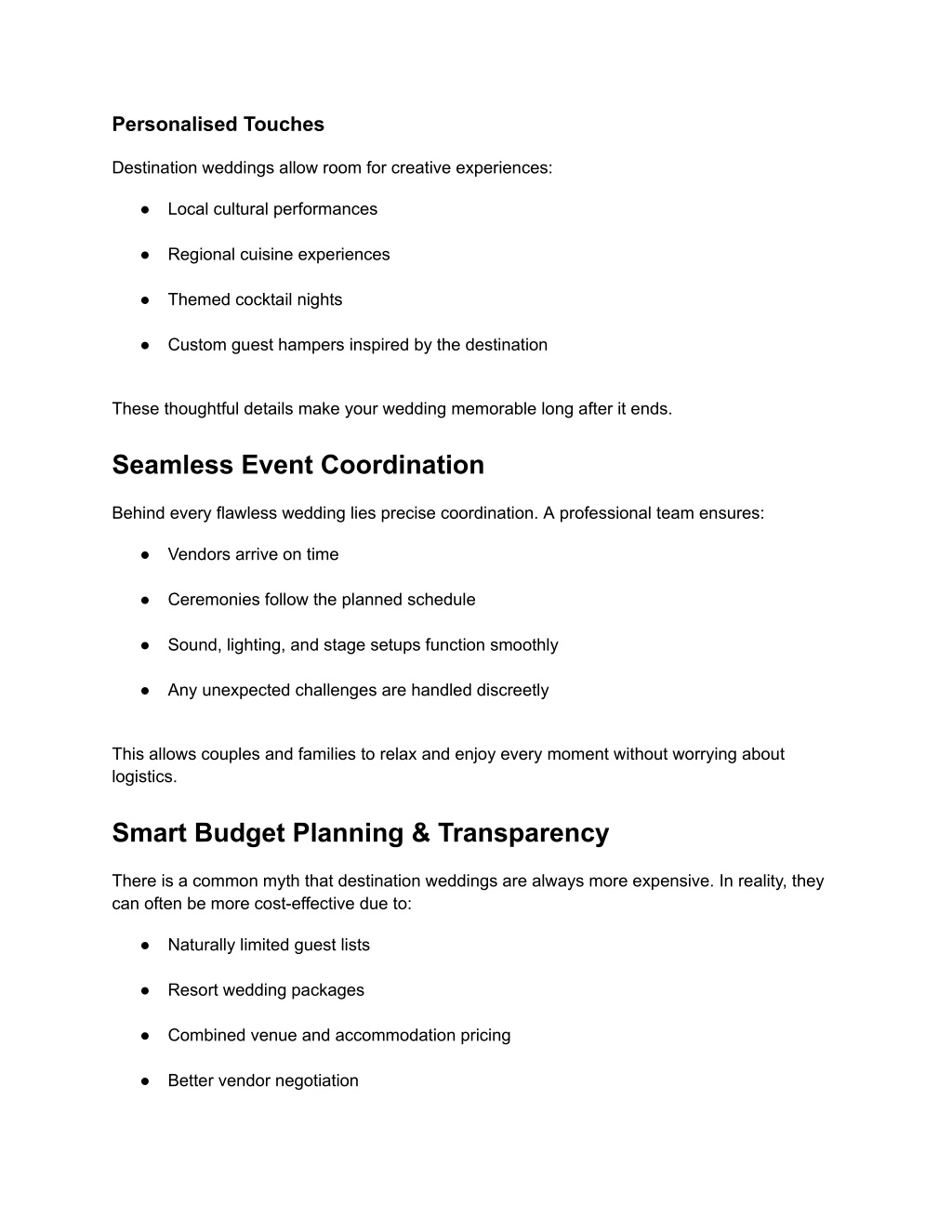Personalised Touches Destination weddings allow room for creative experiences: ● Local cultural performances ● Regional cuisine experiences ● Themed cocktail nights ● Custom guest hampers inspired by the destination These thoughtful details make your wedding memorable long after it ends. Seamless Event Coordination Behind every flawless wedding lies precise coordination. A professional team ensures: ● Vendors arrive on time ● Ceremonies follow the planned schedule ● Sound, lighting, and stage setups function smoothly ● Any unexpected challenges are handled discreetly This allows couples and families to relax and enjoy every moment without worrying about logistics. Smart Budget Planning & Transparency There is a common myth that destination weddings are always more expensive. In reality, they can often be more cost-effective due to: ● Naturally limited guest lists ● Resort wedding packages ● Combined venue and accommodation pricing ● Better vendor negotiation