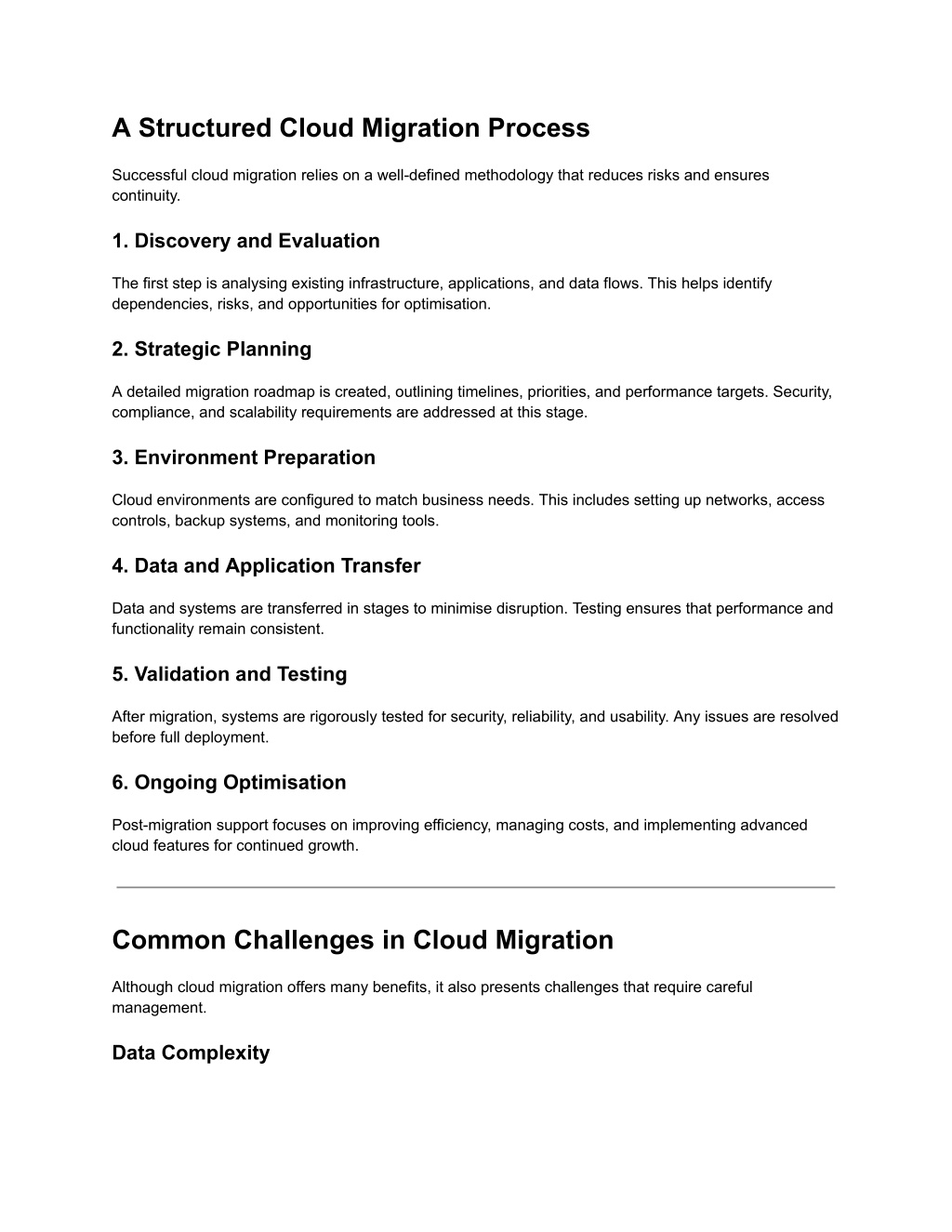 A Structured Cloud Migration Process Successful cloud migration relies on a well-defined methodology that reduces risks and ensures continuity. 1. Discovery and Evaluation The first step is analysing existing infrastructure, applications, and data flows. This helps identify dependencies, risks, and opportunities for optimisation. 2. Strategic Planning A detailed migration roadmap is created, outlining timelines, priorities, and performance targets. Security, compliance, and scalability requirements are addressed at this stage. 3. Environment Preparation Cloud environments are configured to match business needs. This includes setting up networks, access controls, backup systems, and monitoring tools. 4. Data and Application Transfer Data and systems are transferred in stages to minimise disruption. Testing ensures that performance and functionality remain consistent. 5. Validation and Testing After migration, systems are rigorously tested for security, reliability, and usability. Any issues are resolved before full deployment. 6. Ongoing Optimisation Post-migration support focuses on improving efficiency, managing costs, and implementing advanced cloud features for continued growth. Common Challenges in Cloud Migration Although cloud migration offers many benefits, it also presents challenges that require careful management. Data Complexity
